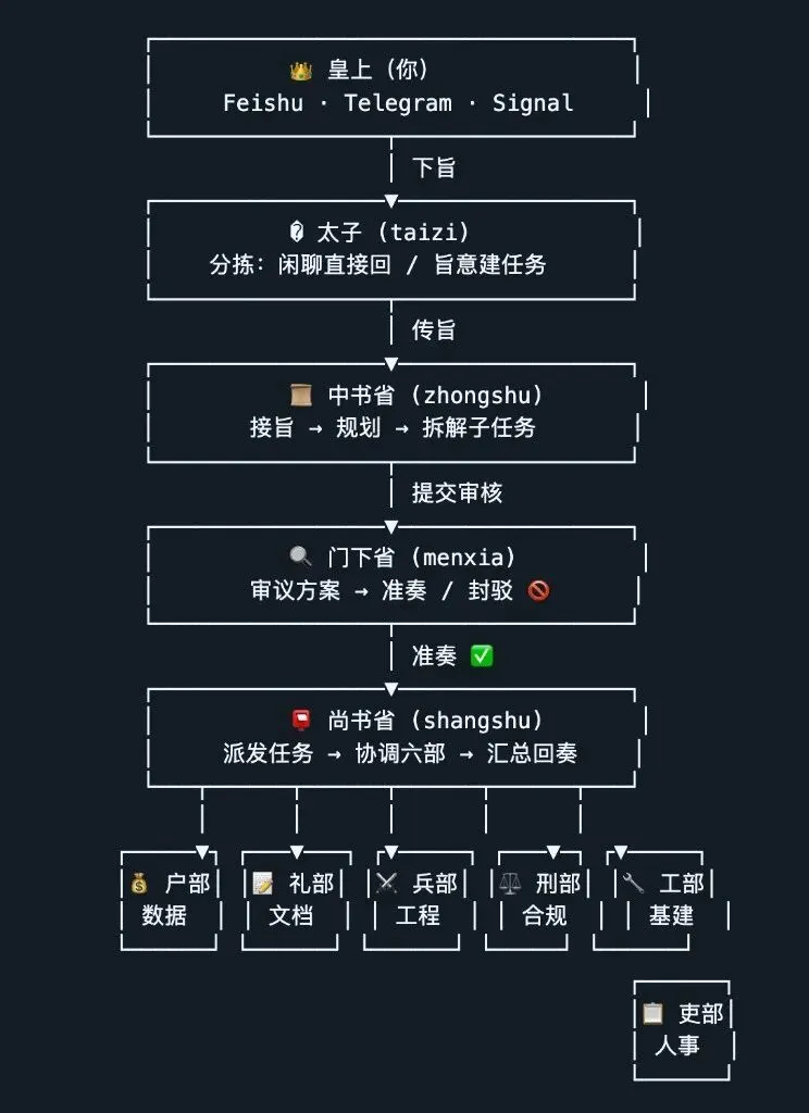 有意思的是,有开发者把 OpenClaw 的架构比作中国古代的三省六部制。