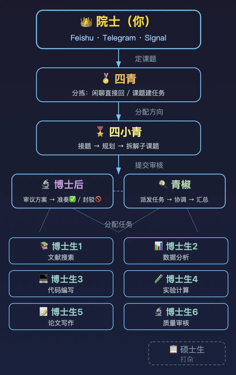 你就是院士(皇上),下旨定课题方向。四青是太子,帮你分拣和建任务。四小青是中书省,接题后规划方案、拆解子课题。博士后和青椒并列,一个审议方案(门下省),一个协调执行(尚书省)。底下的博士生就是六部——博士生 1 搜文献、博士生 2 做数据分析、博士生 3 写代码、博士生 4 跑计算、博士生 5 写论文、博士生 6 做质控。硕士生?在角落打杂。