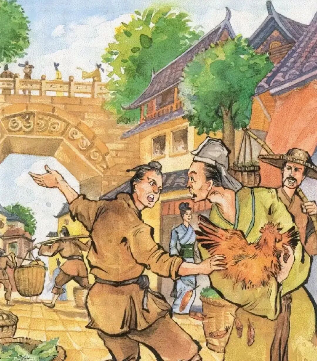 汤知县处理偷鸡贼,一是侮辱,用朱笔在他脸上写了‘偷鸡贼’三个字:二是酷刑,取一面枷枷了,把他偷的鸡,头向后,尾向前,捆在他头上,枷了出去。
