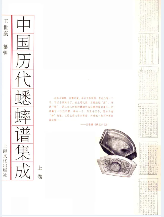 《中国历代蟋蟀谱集成》汇集历代蟋蟀谱之大成,填补我国蟋蟀谱古籍整理的空白,可谓传世经典焕发出新的生机。《中国历代蟋蟀谱集成》重编订正秋虫谱二卷嘉靖丙午刊本,天一阁藏,鼎新图像虫经二卷宋贾秋壑辑万历刊本,上海图书馆藏,促织经二卷宋贾似道编辑明周履靖续增夷门广牍景印,元明善本丛书十种本,中国科学院图书赔藏等。