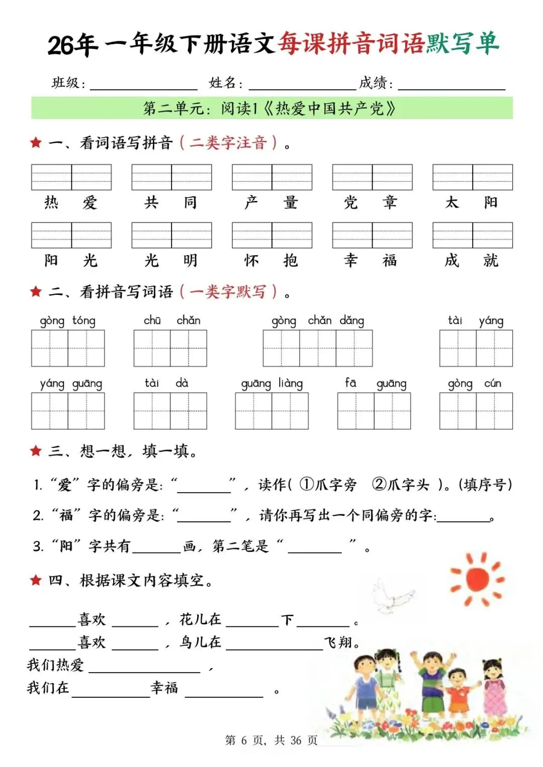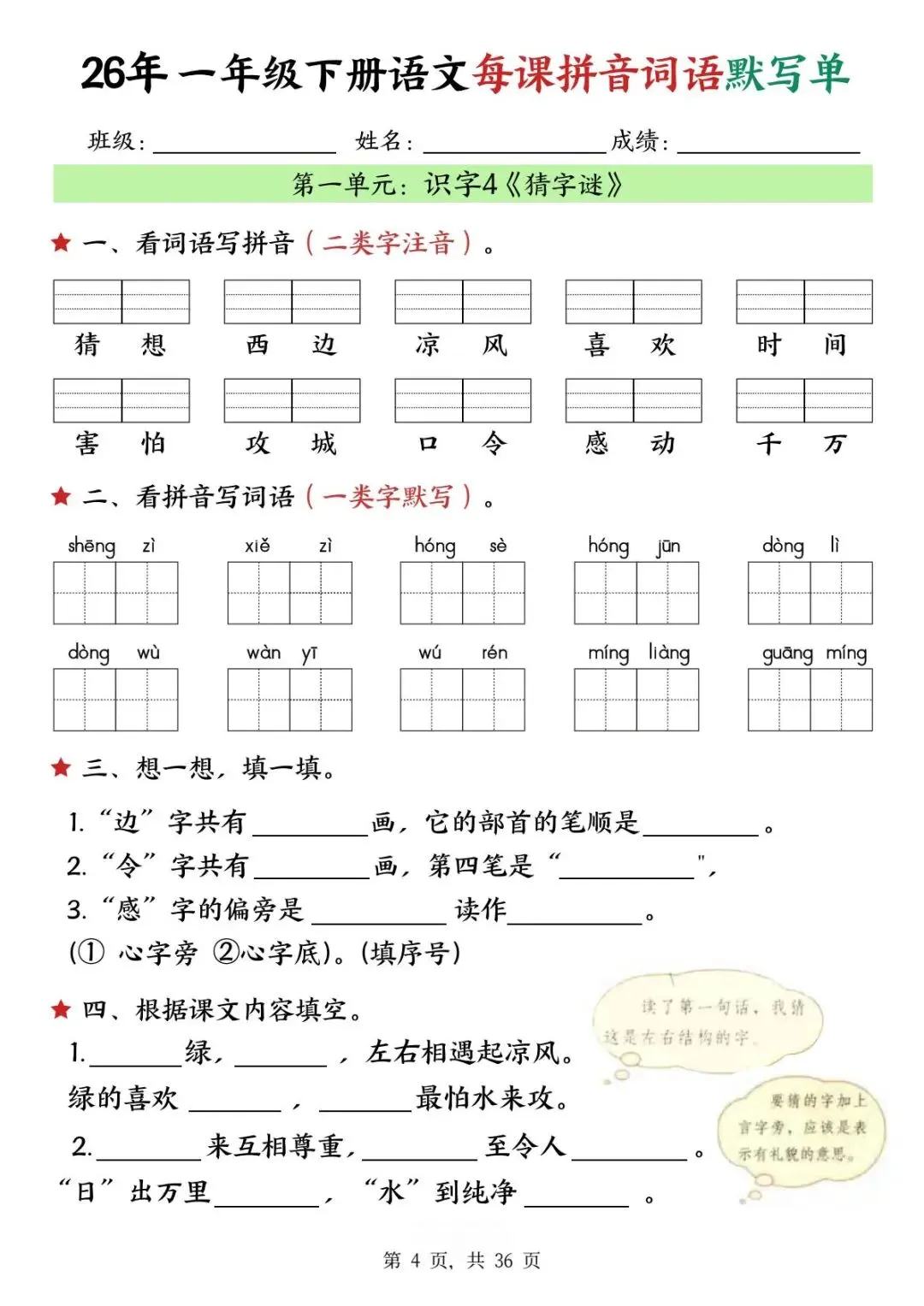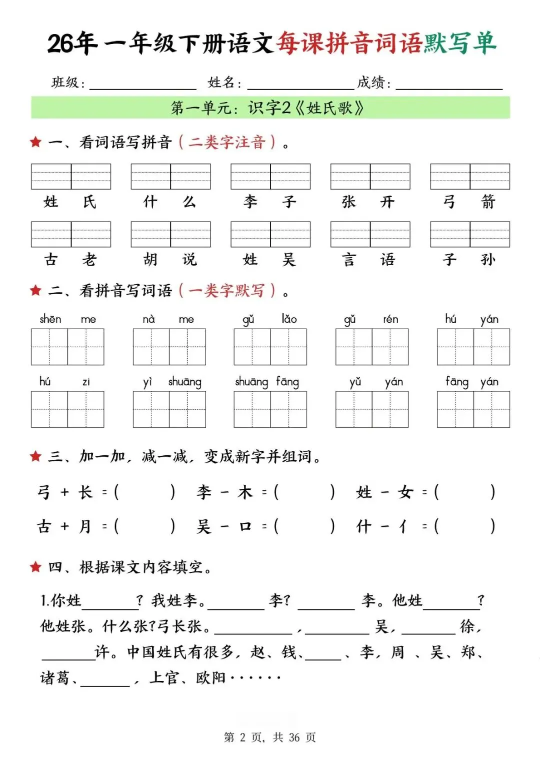这份26年一年级下册语文每课拼音词语默写单【可下载可打印】完整电子版共36页