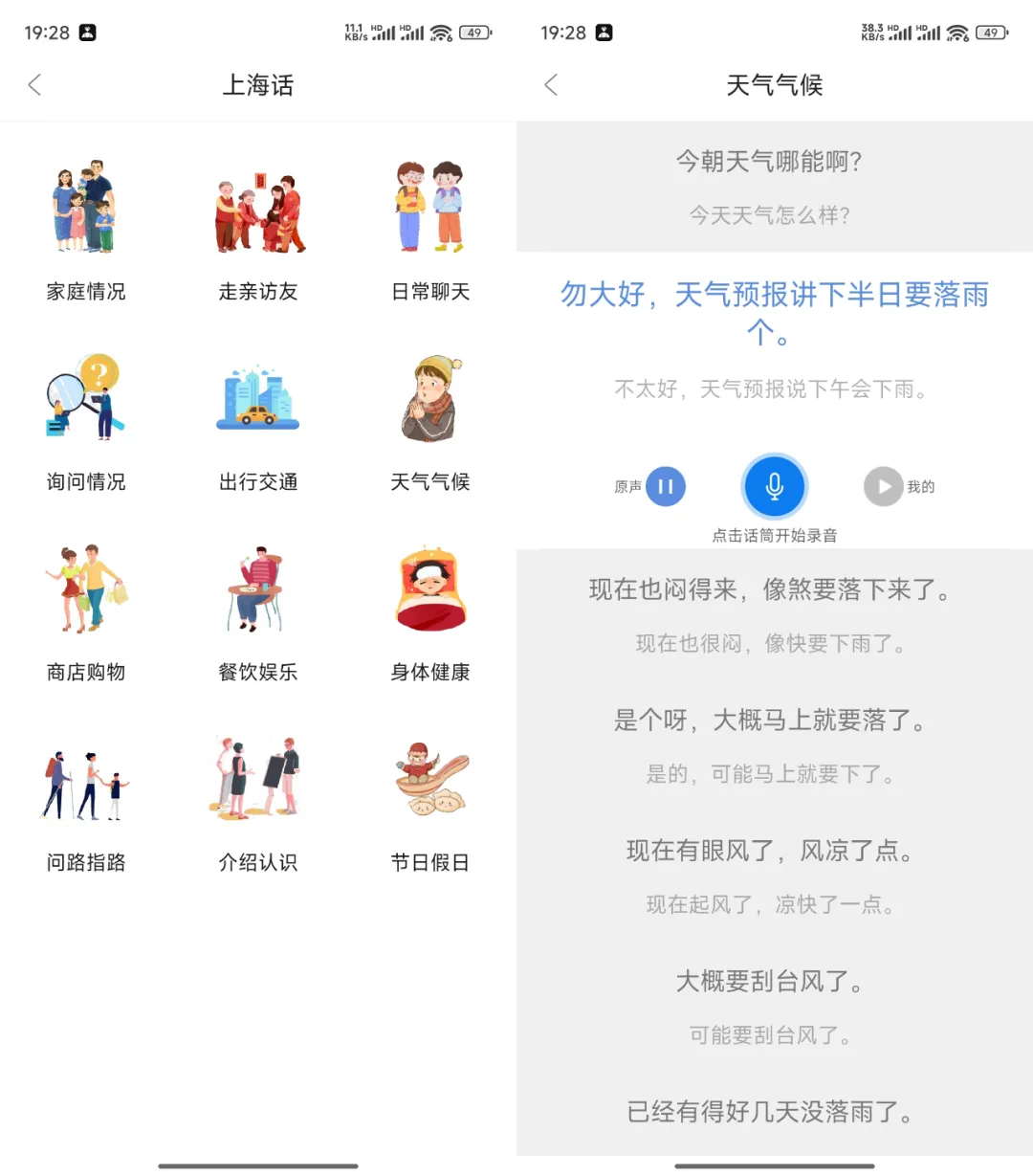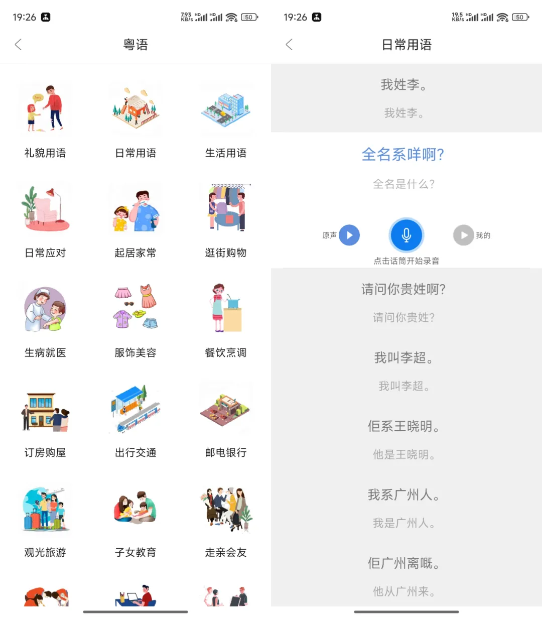 针对日常交流、观光旅游、逛街购物等场景,提供常用语句教学,帮助用户在实际场景中应用方言。例如,学习粤语时,可模拟点餐、问路等场景对话。