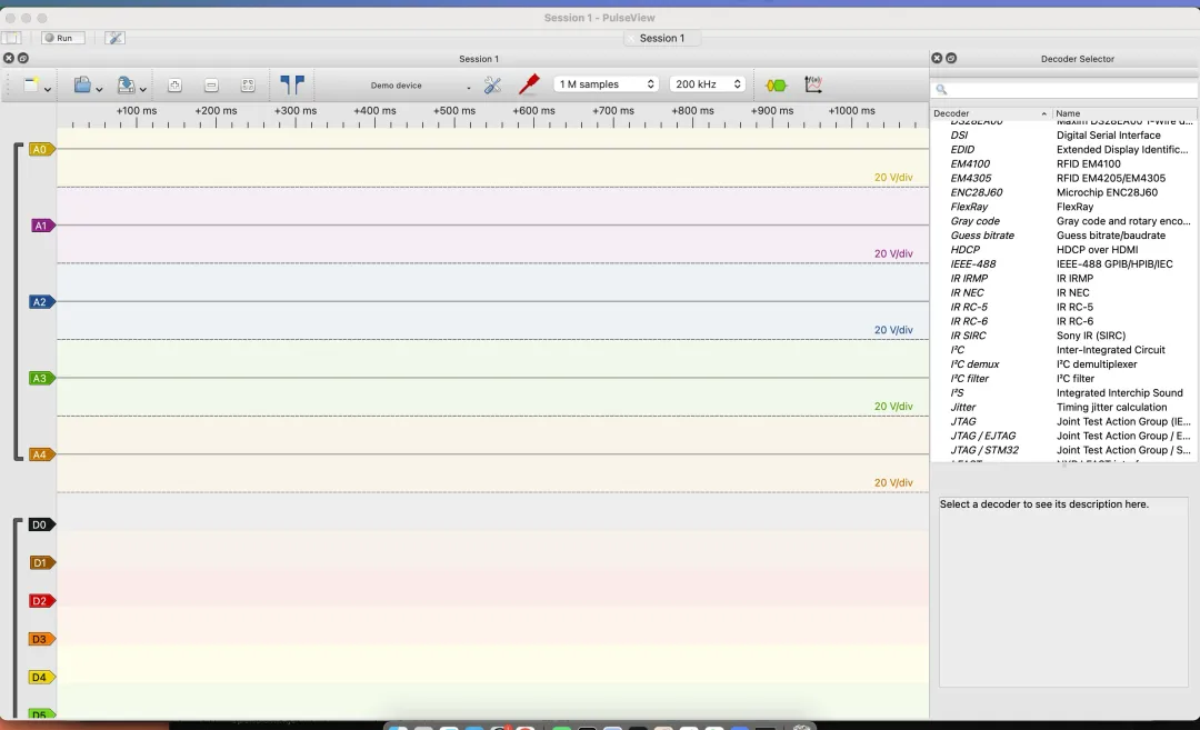 官网https://sigrok.org/wiki/Mac_OS_X提供了下载链接https://sigrok.org/download/binary/pulseview/PulseView-NIGHTLY.dmg。但是,在我的电脑上(MacOS 14.5)安装后无法正常打开,所以尝试通过源码编译安装该软件,所幸过程比较顺利,编译出的可执行文件能正常运行(如上图即为软件打开后的界面)。