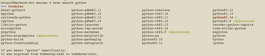 以我的环境为例,使用brew搜索python:brew search python,结果显示并没有python@2、python@3: