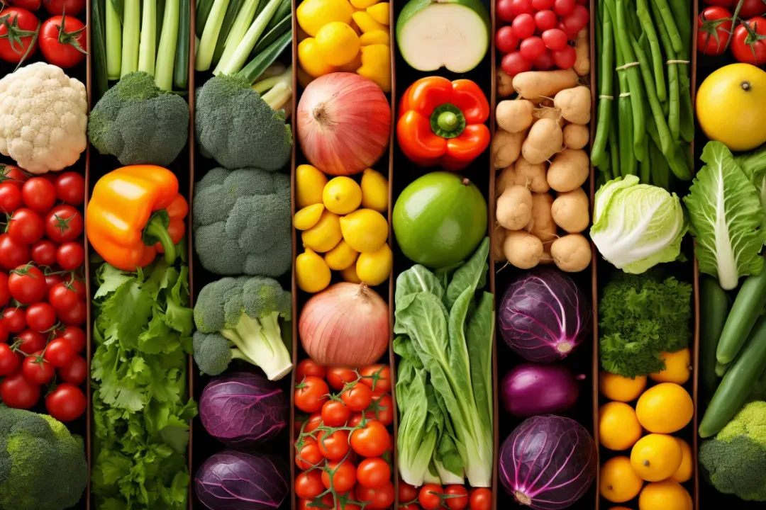 新鲜的应季蔬菜,颜色鲜亮,水分含量高、营养丰富、味道清新,食用这样的新鲜蔬菜水果对人体健康益处多。