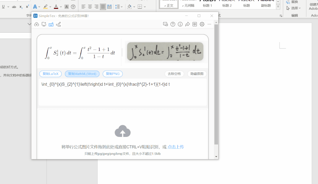 识别完成后根据需要可以直接将识别后的公式粘贴至指定文档中,支持粘贴进Word进行编辑以及直接粘贴为图片。
