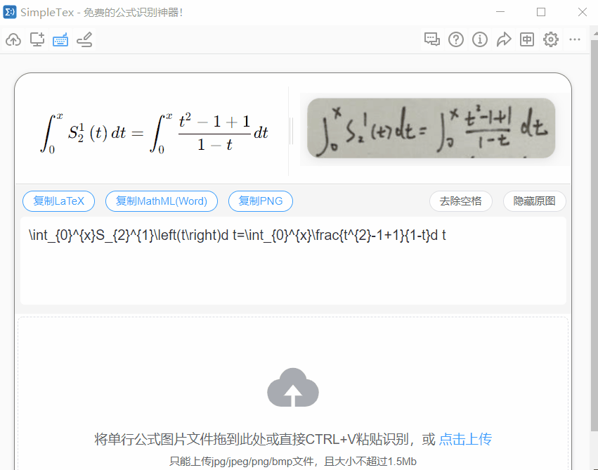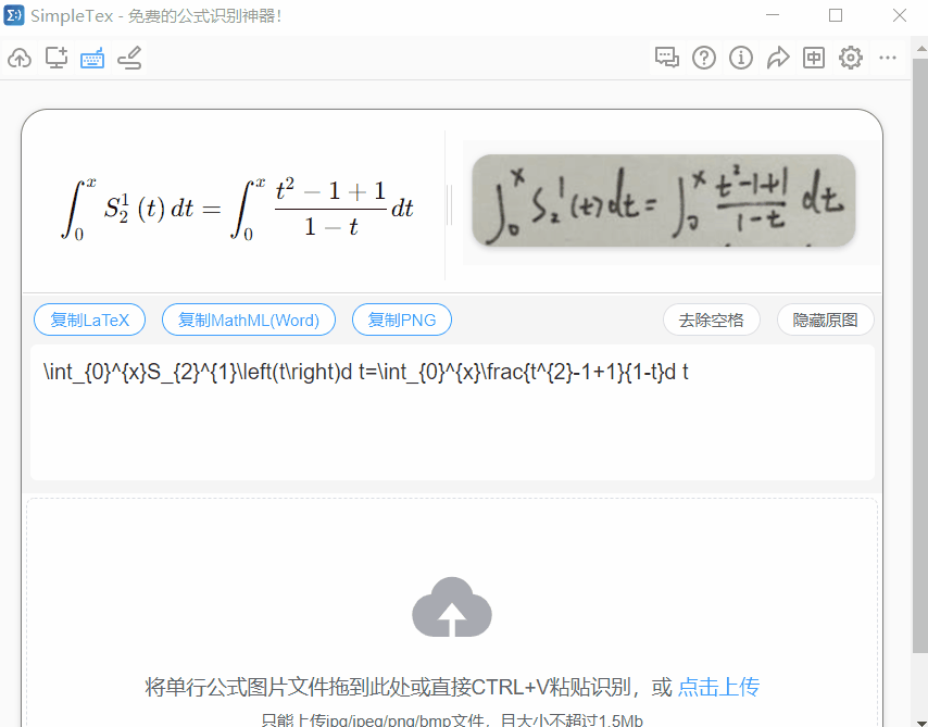 这款软件的细心之处在于提供了一键去除空格,这个真的很有用。因为很多公式识别后会有多余的空格,而如果直接复制粘贴进公式编辑器中会显示其他的字符,然后需要手动去除才行,这款软件就高效很多!