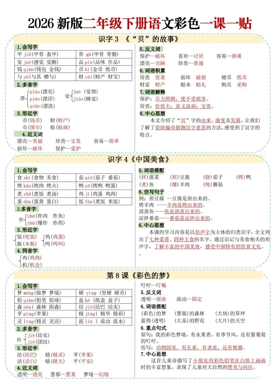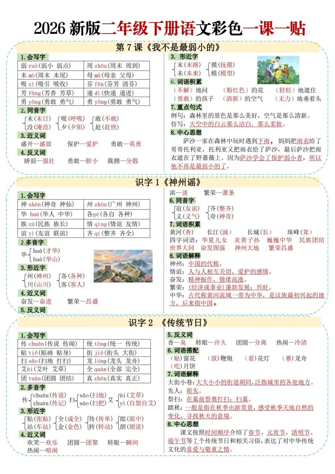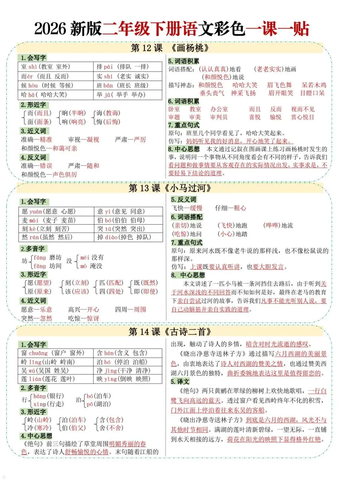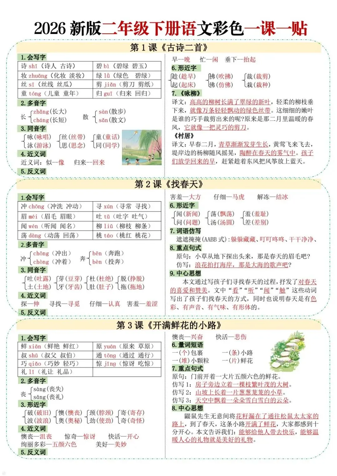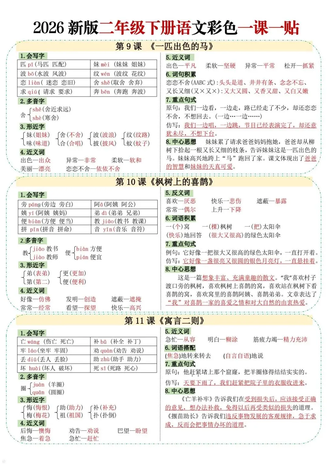 今天给大家分享的是:二年级(下)语文彩色课课贴一课一贴,共10页,电子版可下载打印。文章末尾可直接领取全套电子版,无套路,欢迎收藏和下载。如果觉得这份资料不错,建议分享到班级群/年级群,让其他家长打印出来,帮助孩子学习;如果觉得合适,请支持正版!