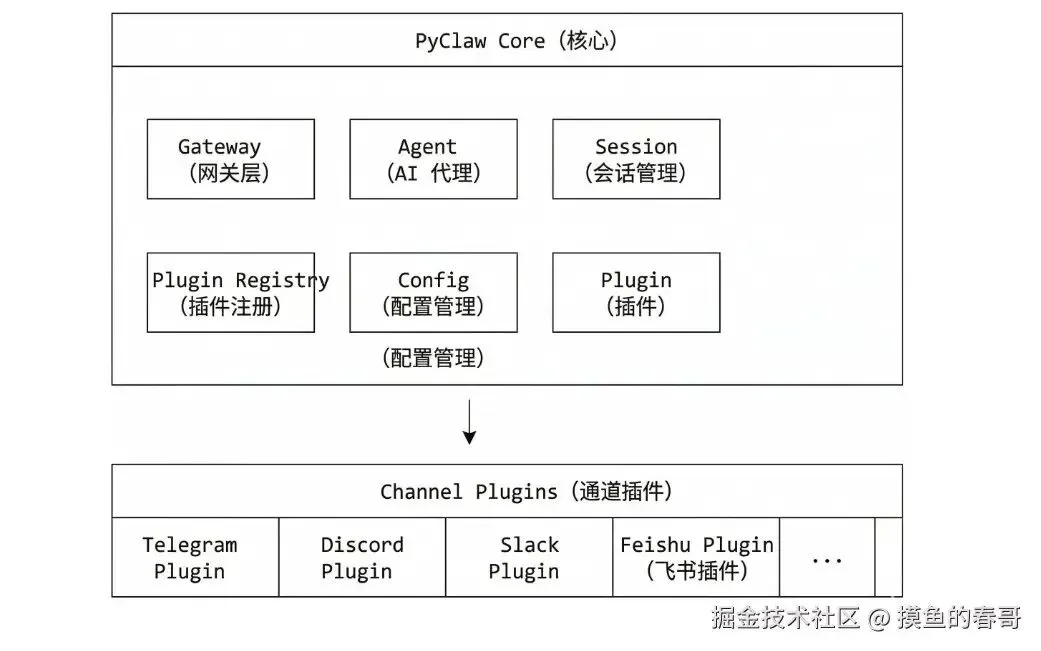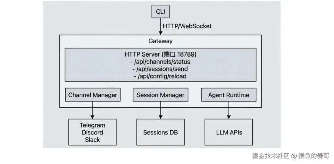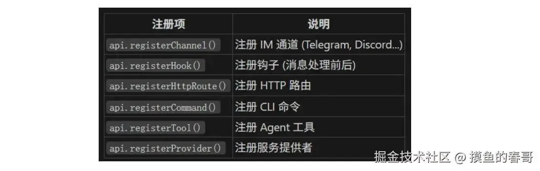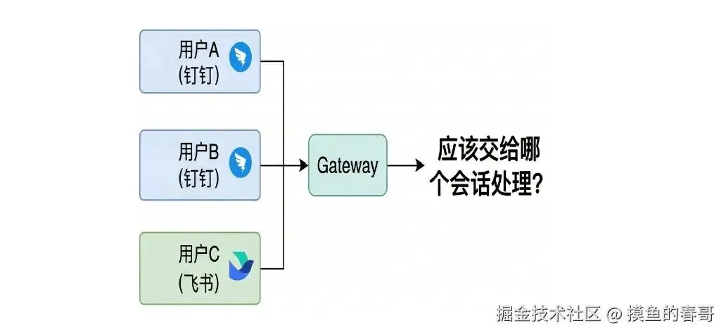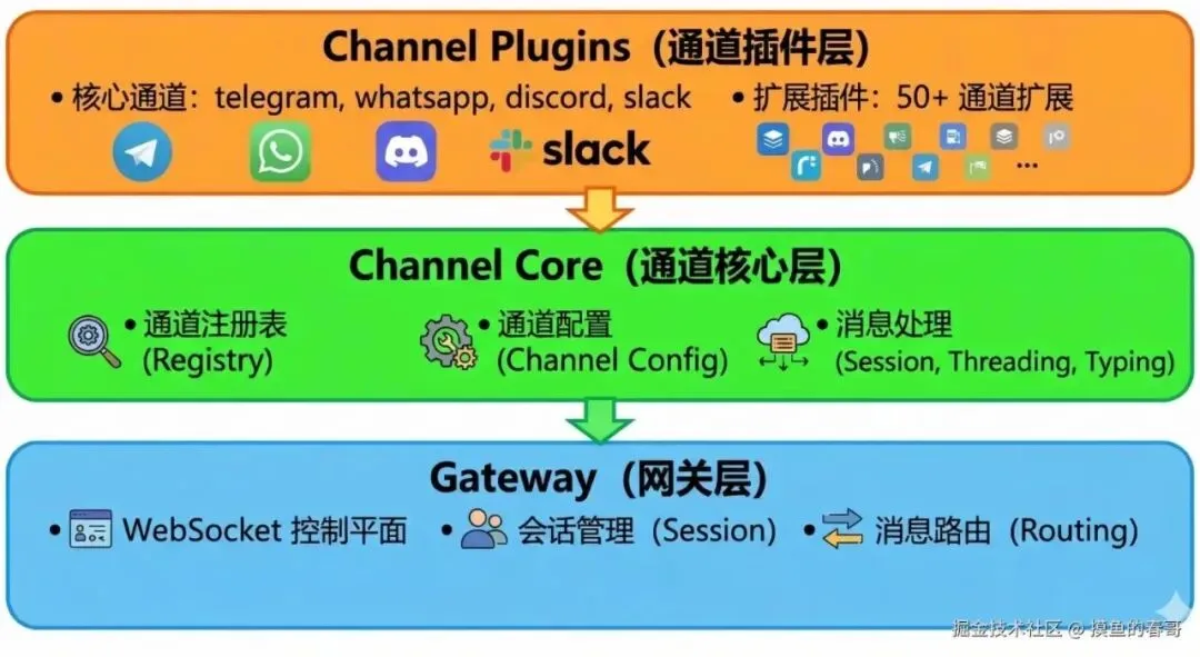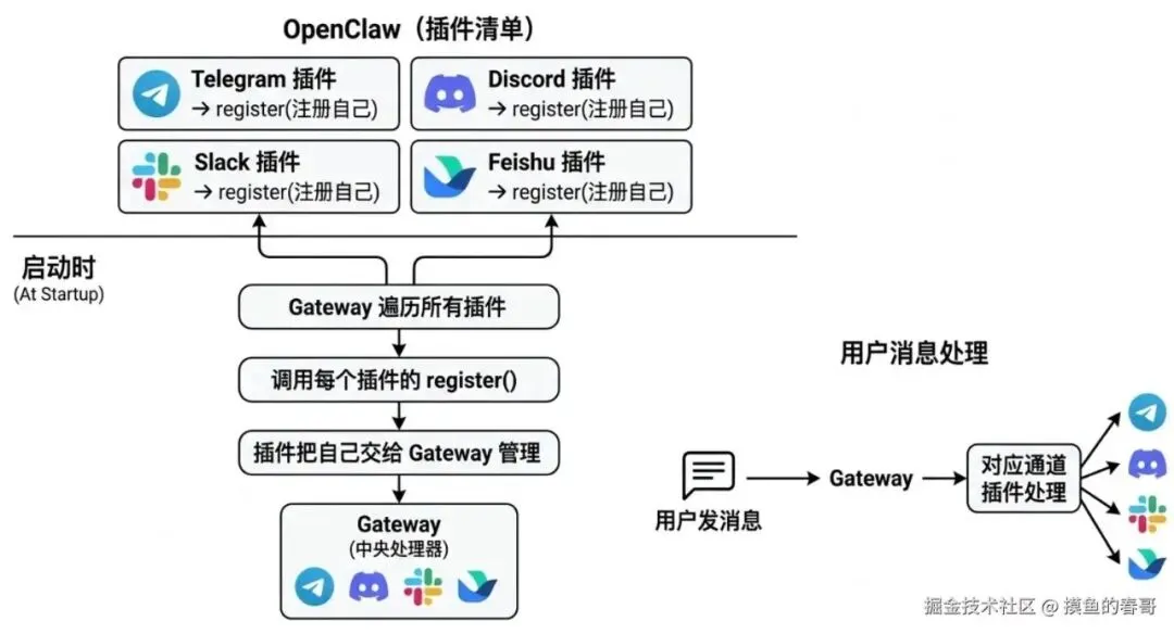 各 IM 接入方式不一,所以需要统一的插件接口:你实现一套标准抽象,网关只认这一套,具体是 QQ 还是飞书由插件内部适配。这样加新通道就只加插件,不用改网关核心。接口会约定消息入参/出参、鉴权方式、可选能力(如文件、富文本),插件注册进网关后,网关按配置加载。原文里有代码示例,核心就是「统一接口 + 插件注册表」。