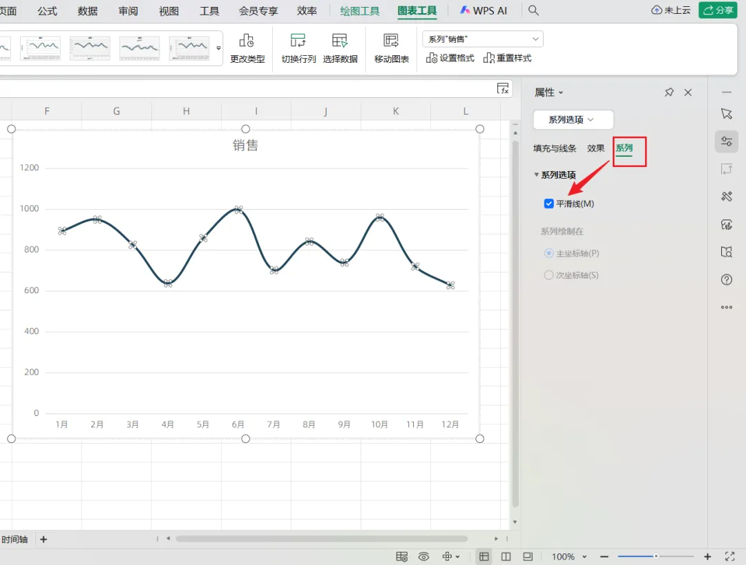 而对于使用WPS的小伙伴,在【填充与线条】那里,是找不到的【平滑线】的哟,而必须在【系列】-【系列选项】处,才可以找到对应的设置选项。