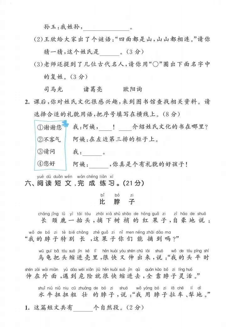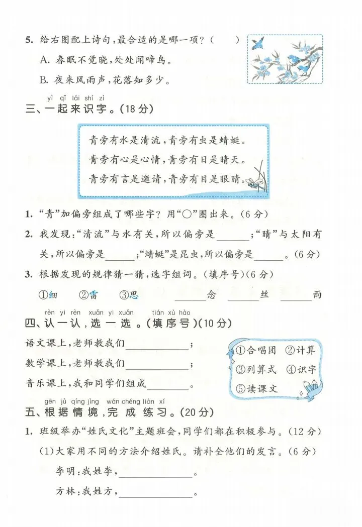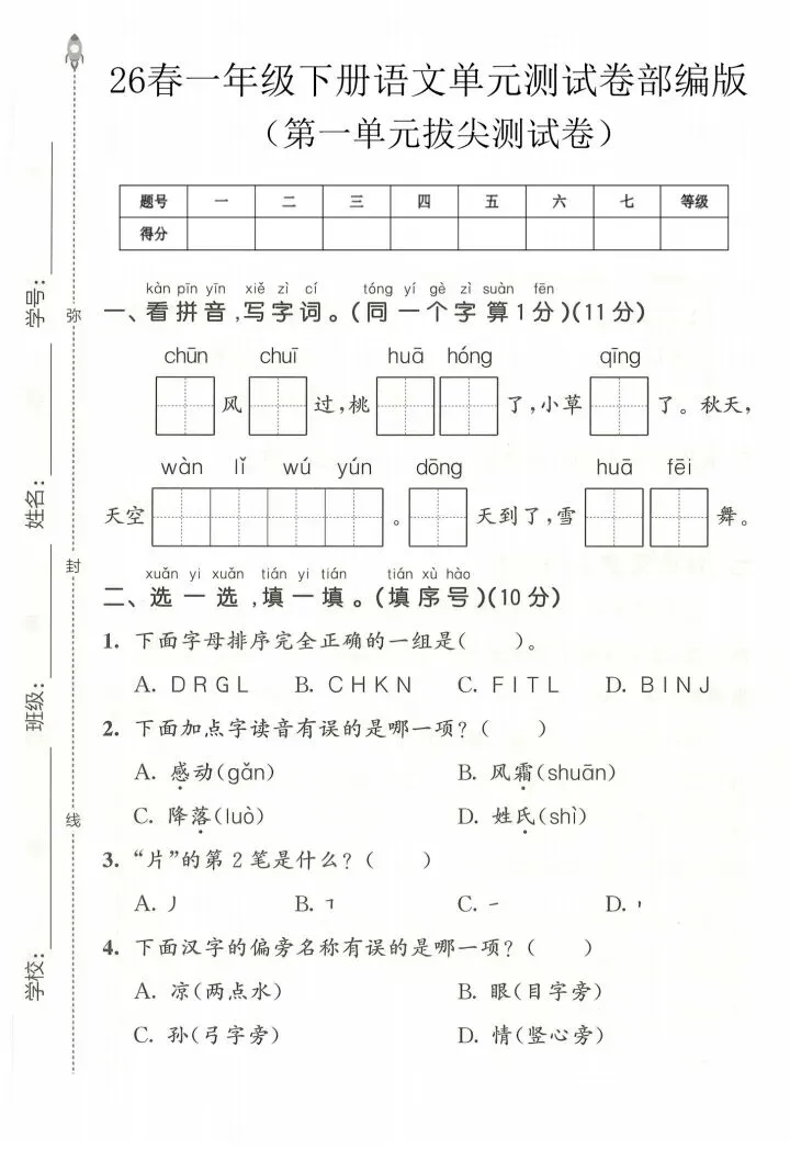 一年级下册语文第一单元测试卷 电子版 可打印