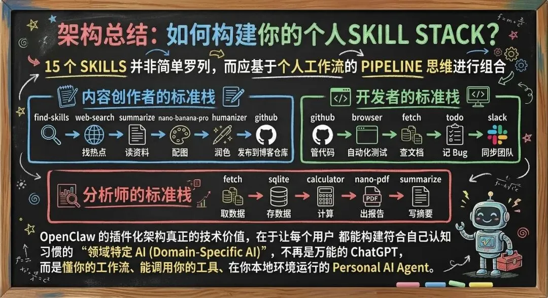 15个 Skills 并非简单罗列,而应基于个人工作流的 Pipeline 思维进行组合: