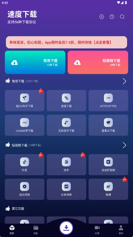 速度下载app,支持56种下载协议,短视频下载,手机下载神器