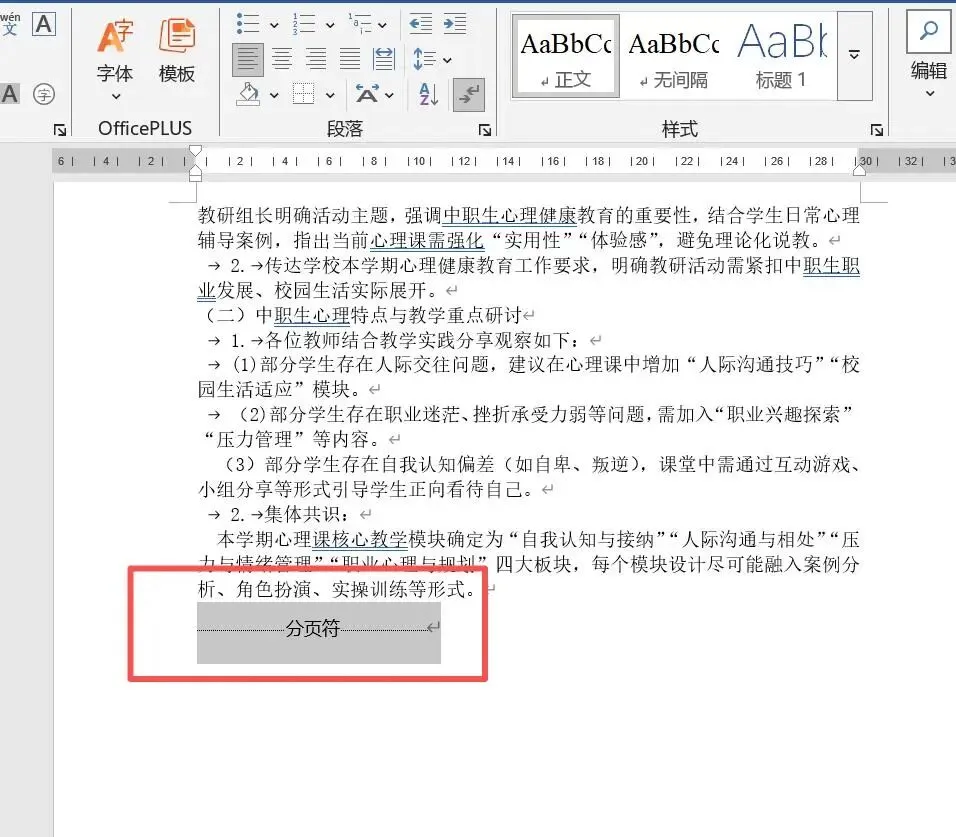 先点击一下开始选项卡中的段落标记图标,然后会看到文章最后有个分页符,我们选中它并删除,就会发现空白页消失了: