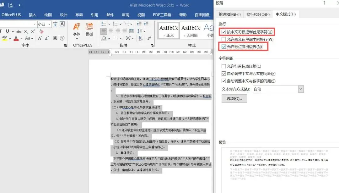 这时候点击右键,选择段落,找到“中文版式”选项卡,将第一项和第三项都打上勾,点击确定就可以了。