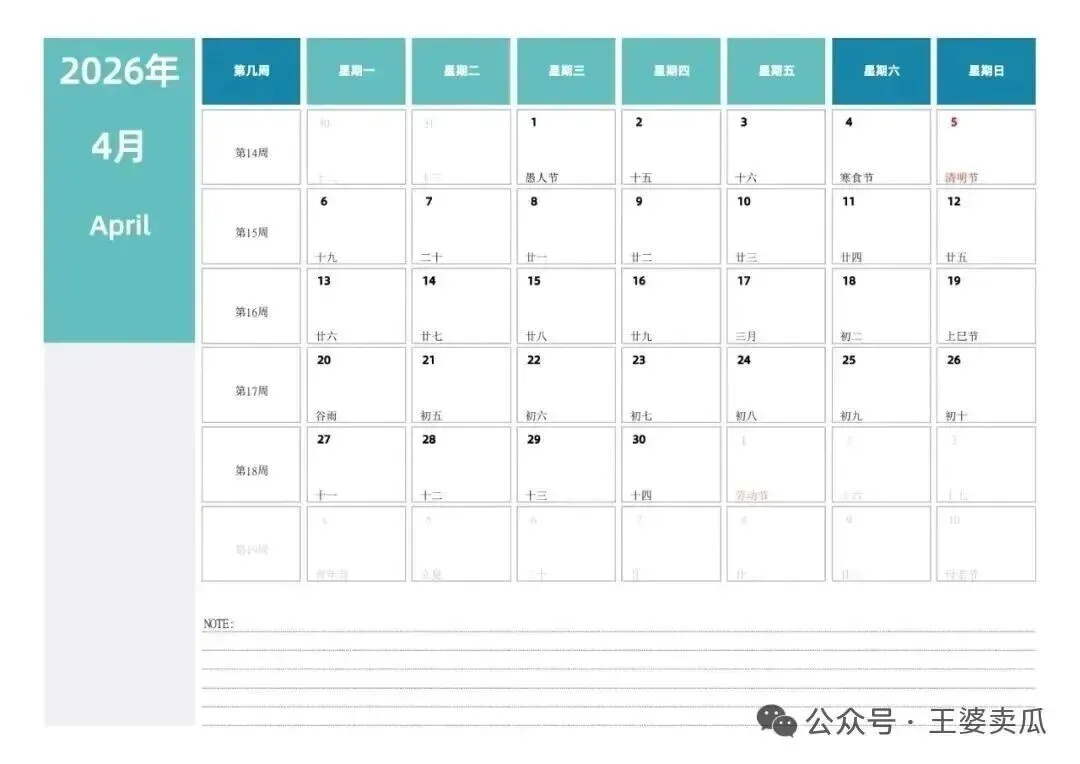 2026年日历全年表,word+excel,电子版可打印【含阳历阴历农历】