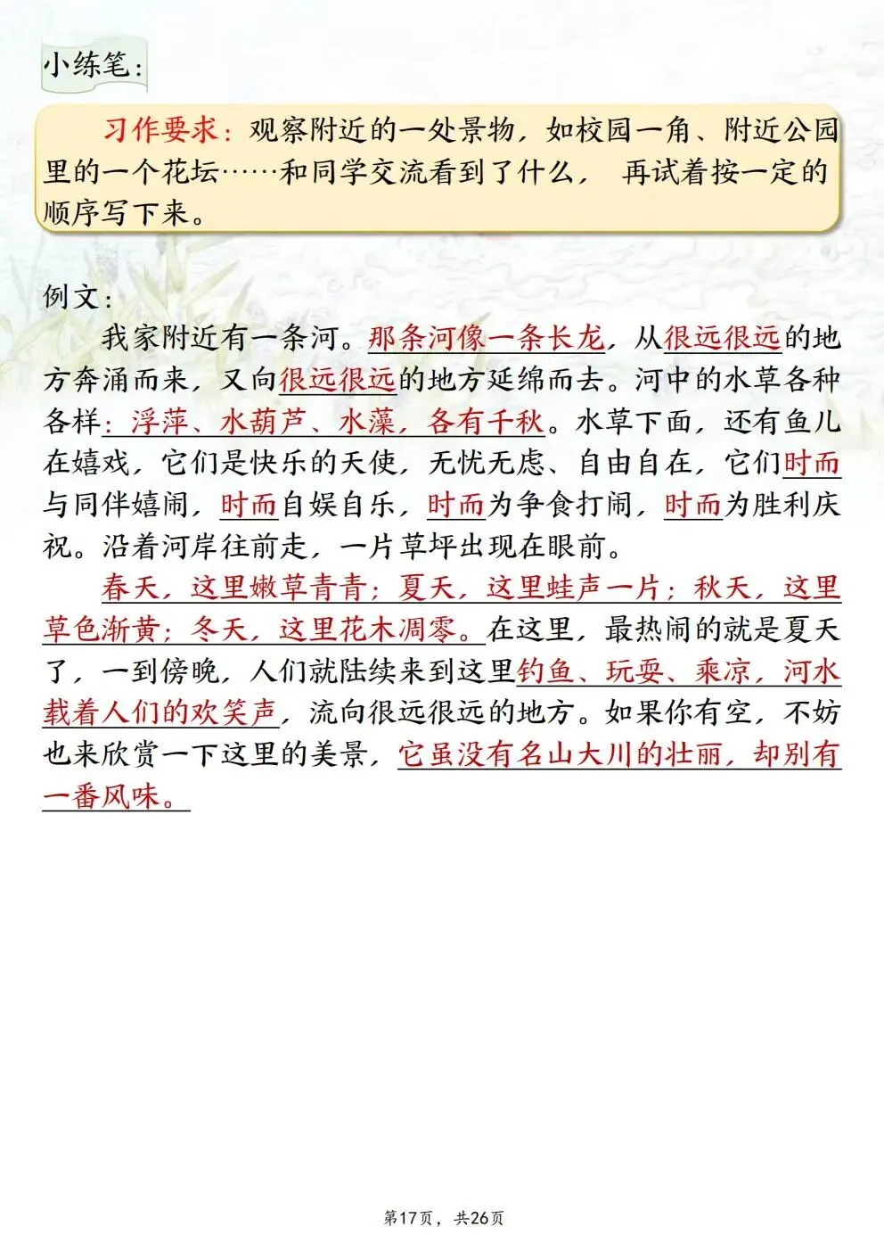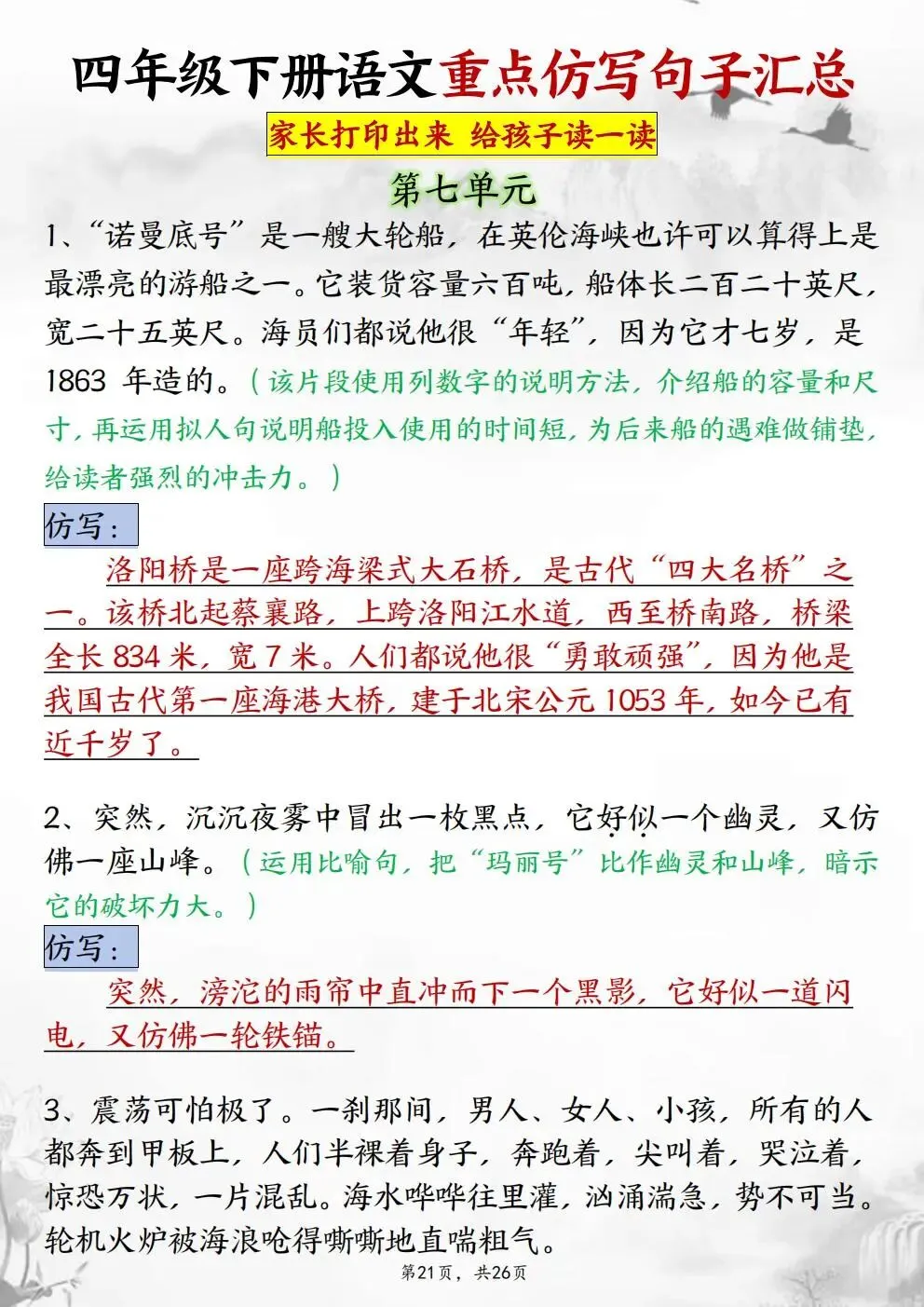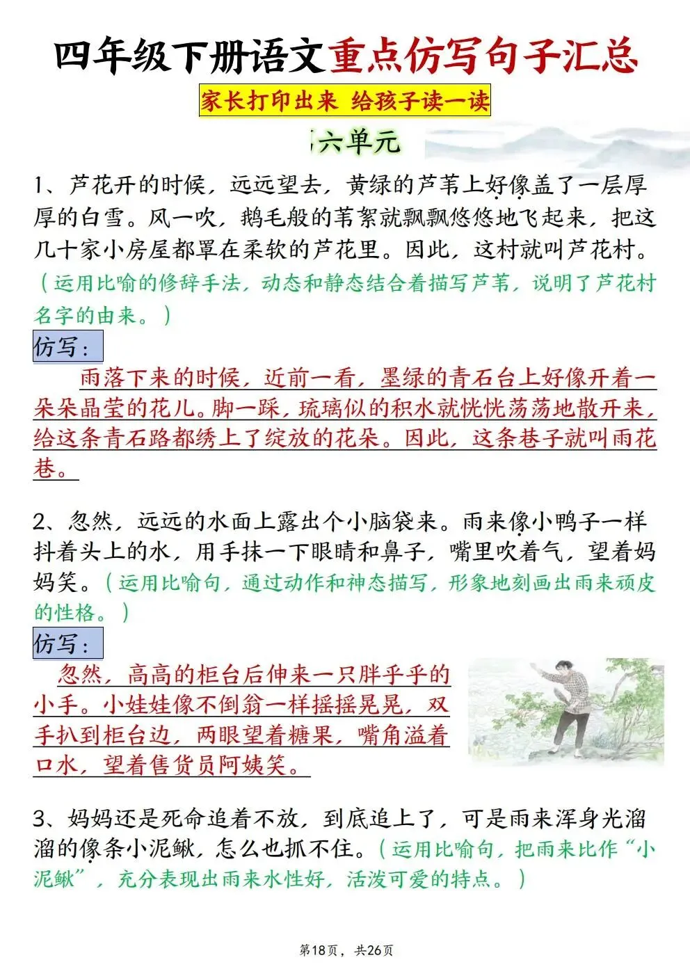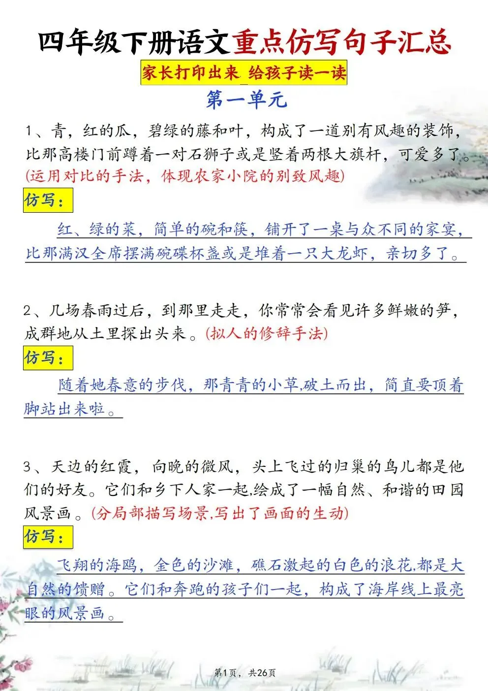 本站文章均为手工撰写未经允许谢绝转载:夜雨聆风 » 四年级下册语文重点仿写句子汇总(电子版可打印)