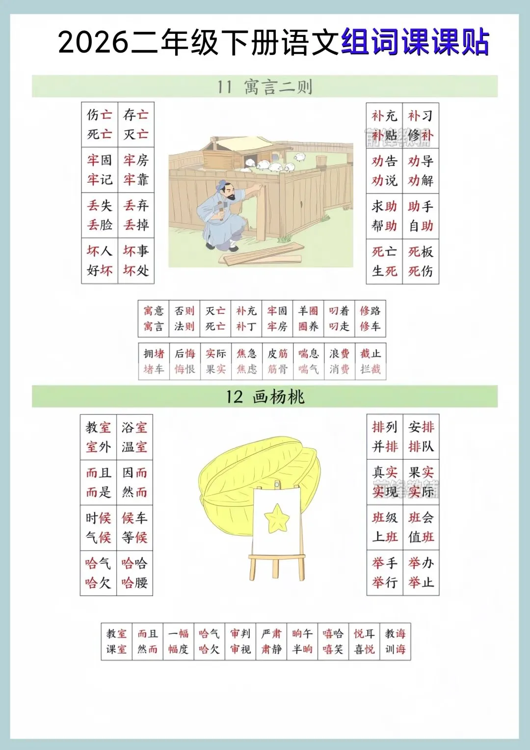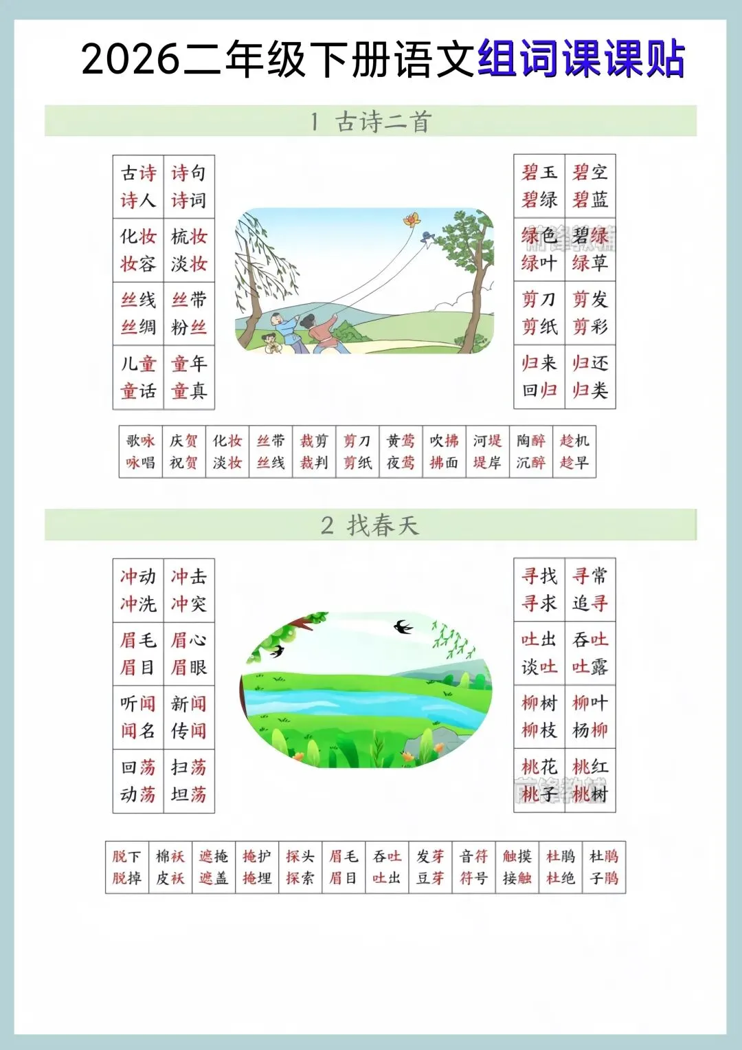 今天分享学习资料是:二年级下册语文组词课课贴,文末有电子版获取方式。如果觉得这份资料不错,建议分享到班级群/年级群,让其他家长打印出来,帮助孩子学习。