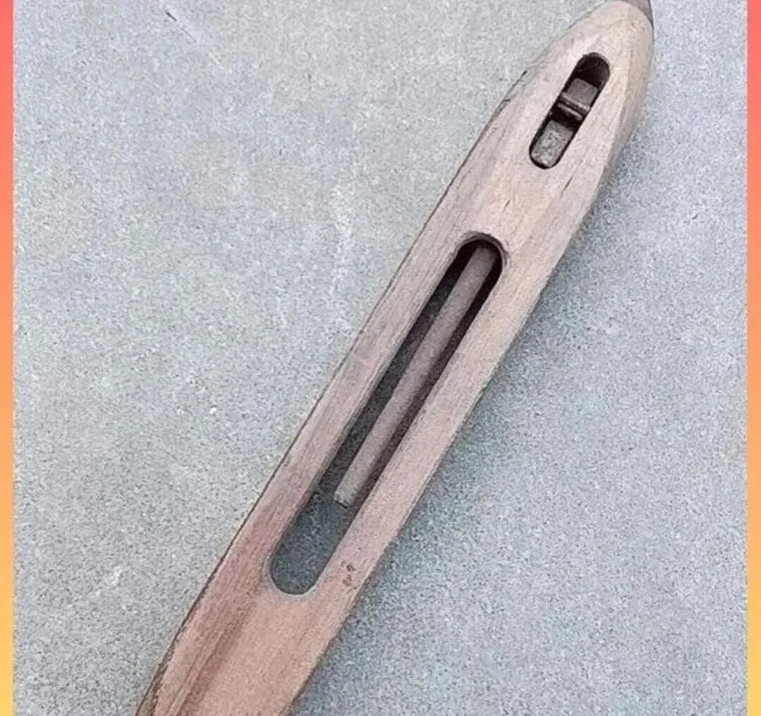 图中这条长条的木家伙叫木梭子,身子扁长两头尖,中间开着槽,里头装小线轴,轻轻一抛就在经线之间穿过去,娘年轻时一脚一脚踩踏板,手上把梭子从这边丢到那边,织口布像从井里往上冒水那样慢慢长,梭子身上油亮油亮的不是涂的,是年年岁岁的手汗磨出来的光,小时候我伸手去抓总被她瞪一眼,说这可是吃饭的家伙呢,现在衣服被商场包圆,家里织布机散了架,木梭子躺在箱角里一声不吭。