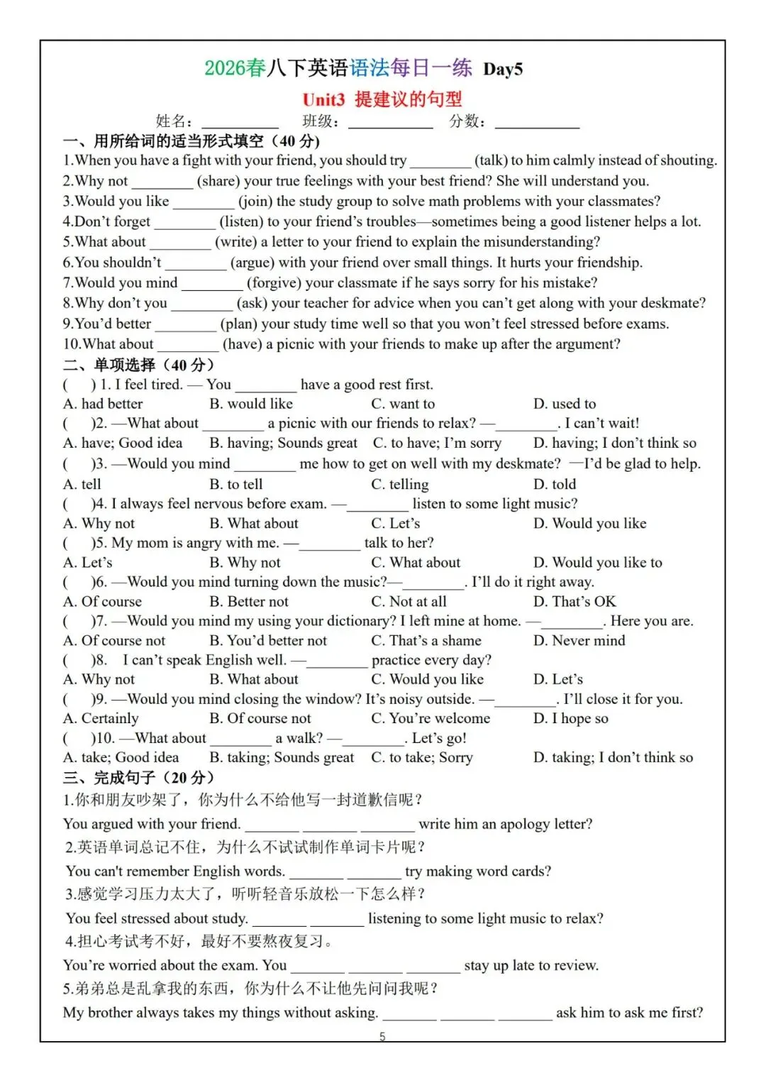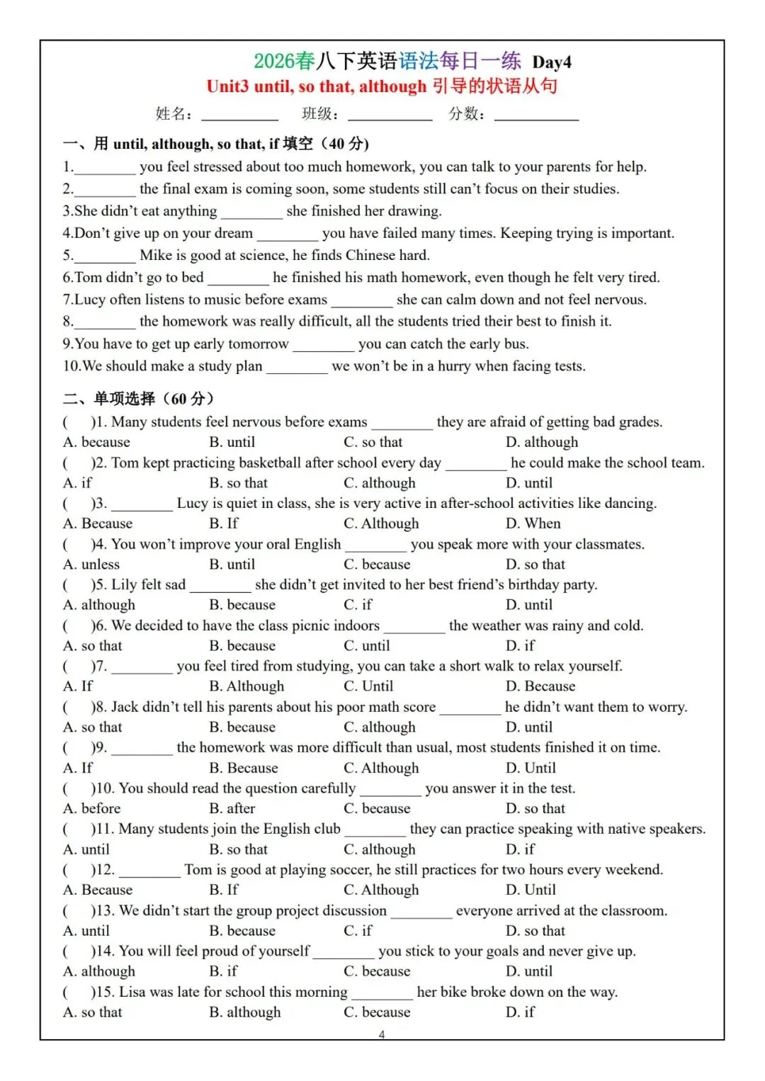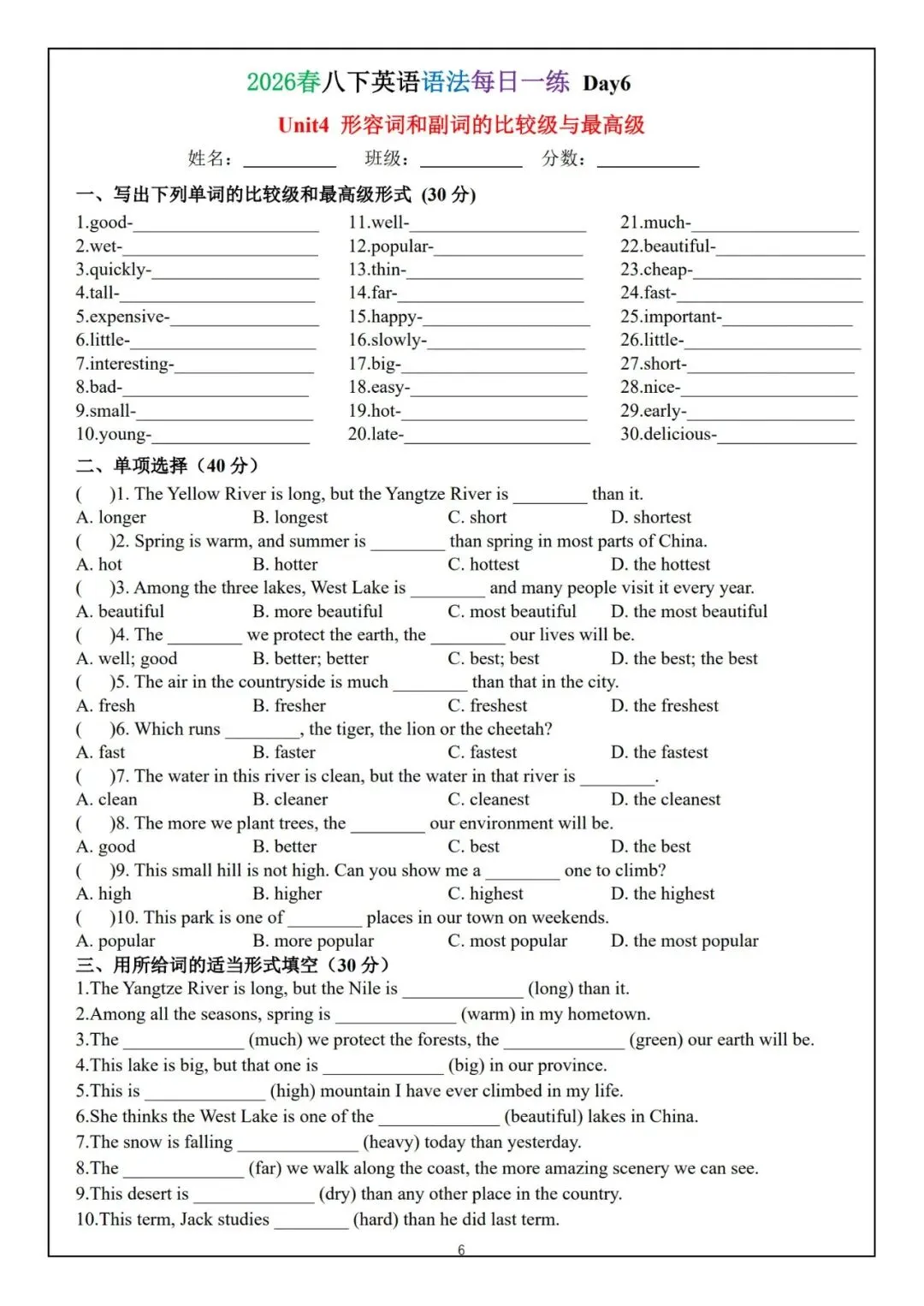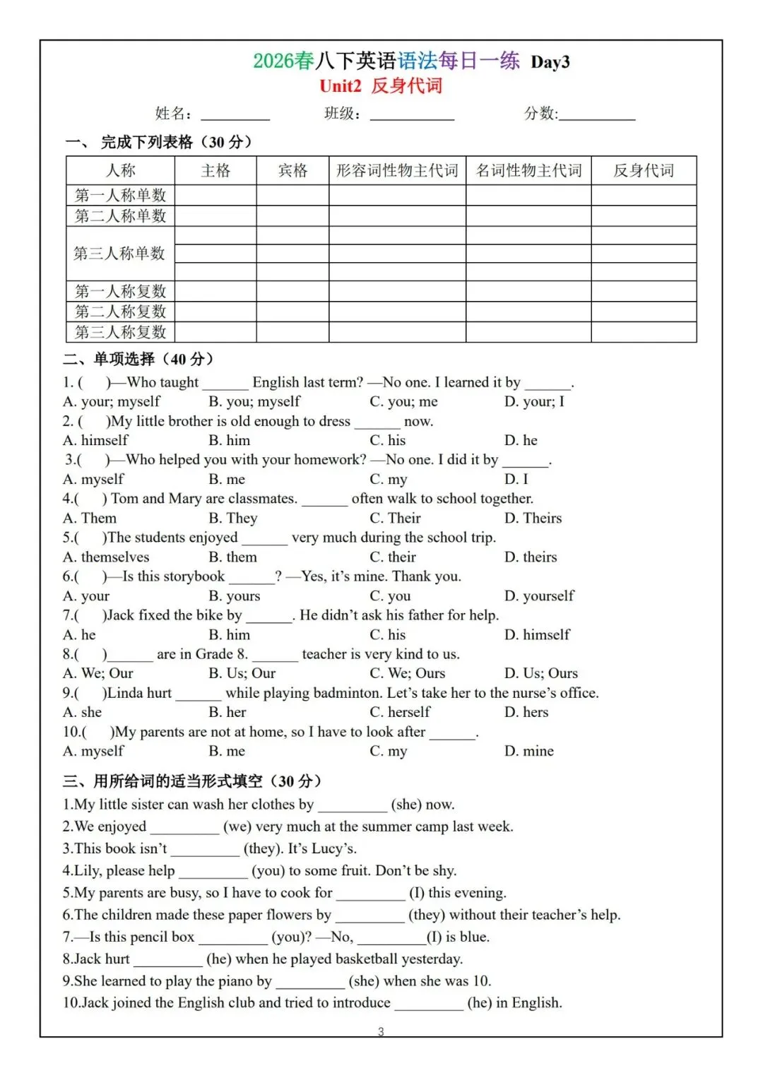 今日为大家更新了最近超火的学习资料,2026春八下英语语法每日一练(电子版可打印),建议分享到班级群/年级群,让其他家长打印出来,帮助孩子学习!