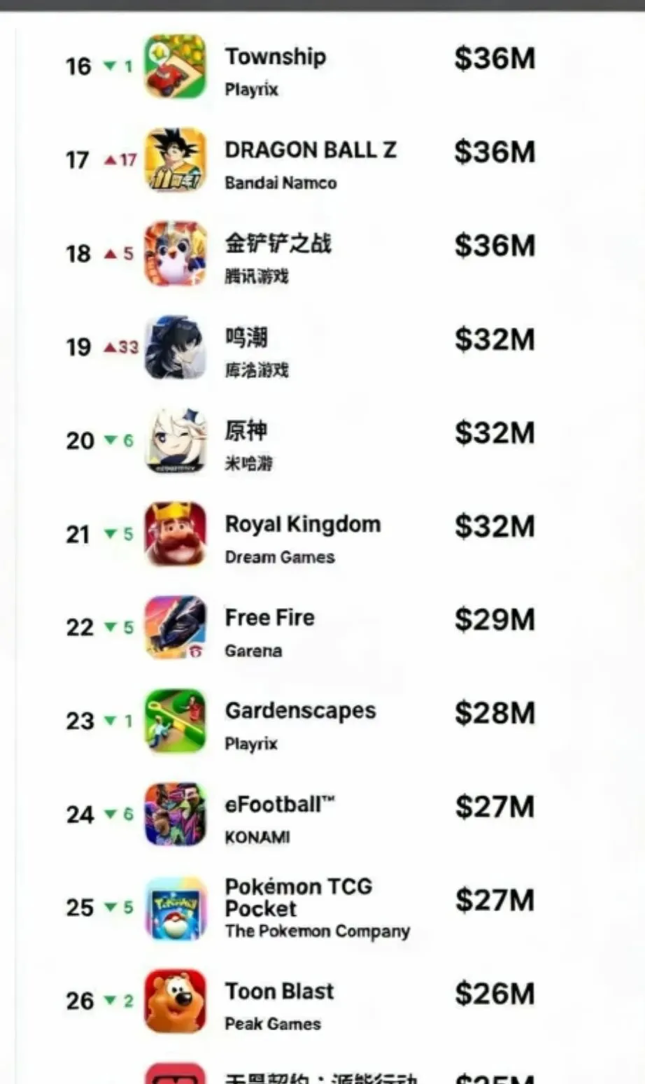 米哈游的《原神》虽然排名略有下滑,但依然稳居前列,而《鸣潮》的崛起,也让库洛在开放世界赛道的竞争力越来越强。