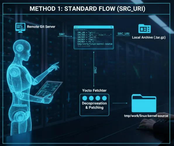 概述: 通过修改 Recipe 文件(.bb 或 .bbappend),直接告诉 Yocto 去哪里下载代码。Yocto 会自动管理下载、解压、打补丁的全过程。
