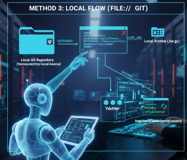 概述: 利用 Yocto 的 Fetcher 机制,支持 file:// 协议指向本地的 Git 仓库。Yocto 会把它当成一个远程仓库来处理,但实际是在本地操作。