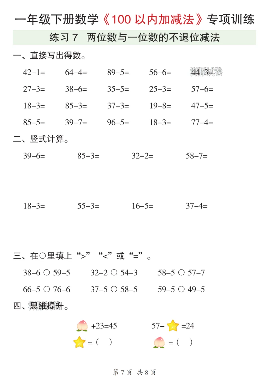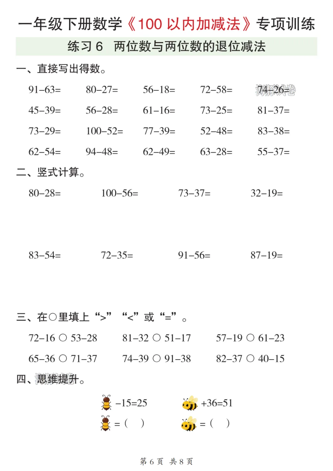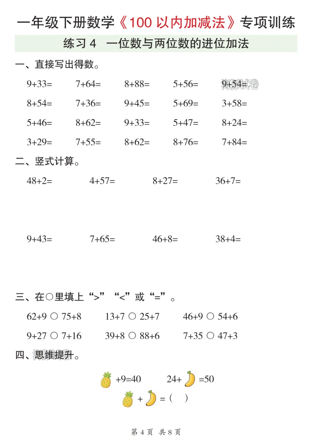 26年一年级数学下册《100以内加减法》可下载打印