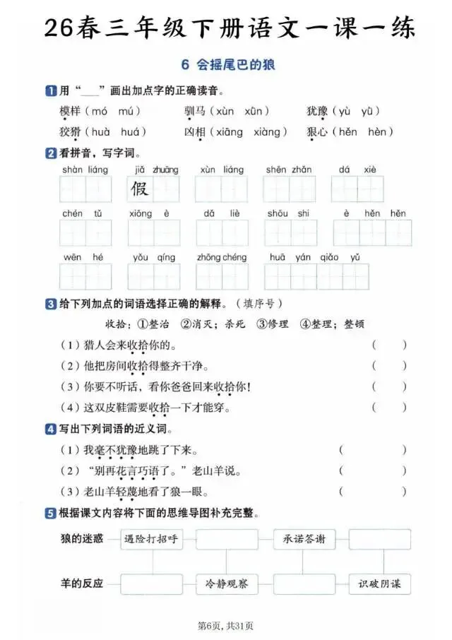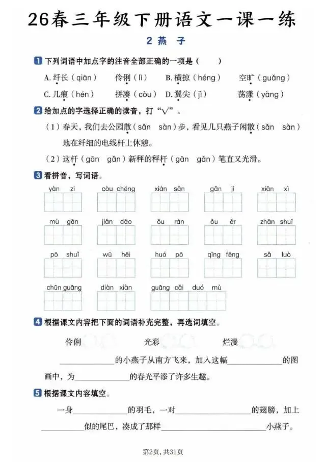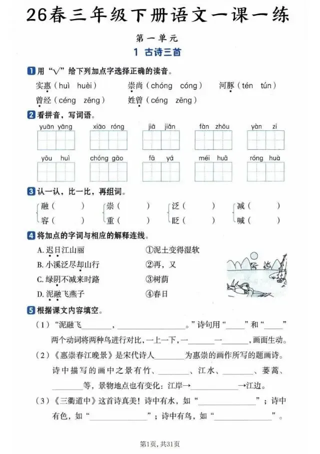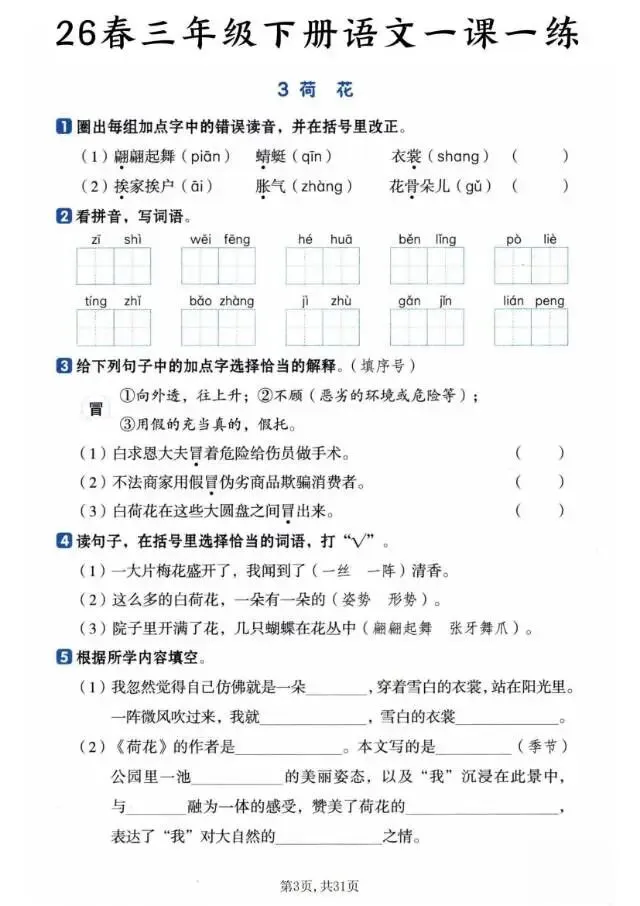 2026春《三年级下册语文一课一练》电子版可打印