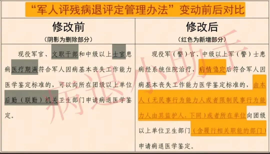 新版的军人评残病退评定管理办法在申报环节的要求中删除了医疗期满的要求,改为经系统住院,病情稳定后。