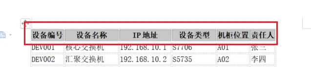 | 核心交换机 | 192.168.1.1 | S7706 | A01 | 张三 |