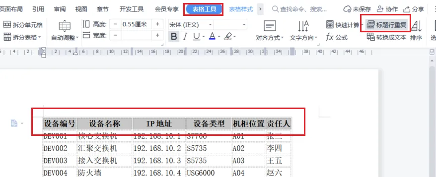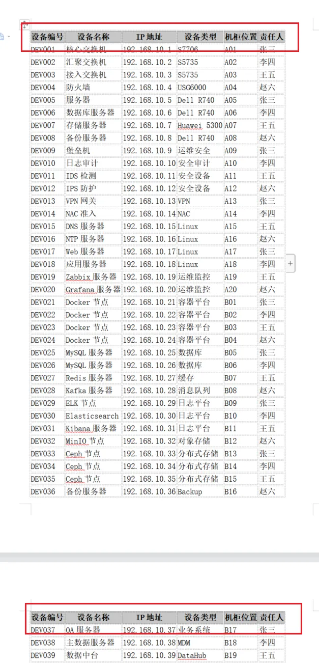 对于像 机房设备统计、服务器清单、网络资产台账 这样的表格,标题行重复是标准文档规范。