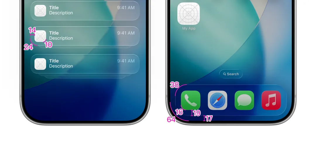 容器的圆角大了,边距也要大一些,否则看起来就很奇怪。例如下图,iOS 26 加大圆角的同时,也把间距从16和19加到了22。