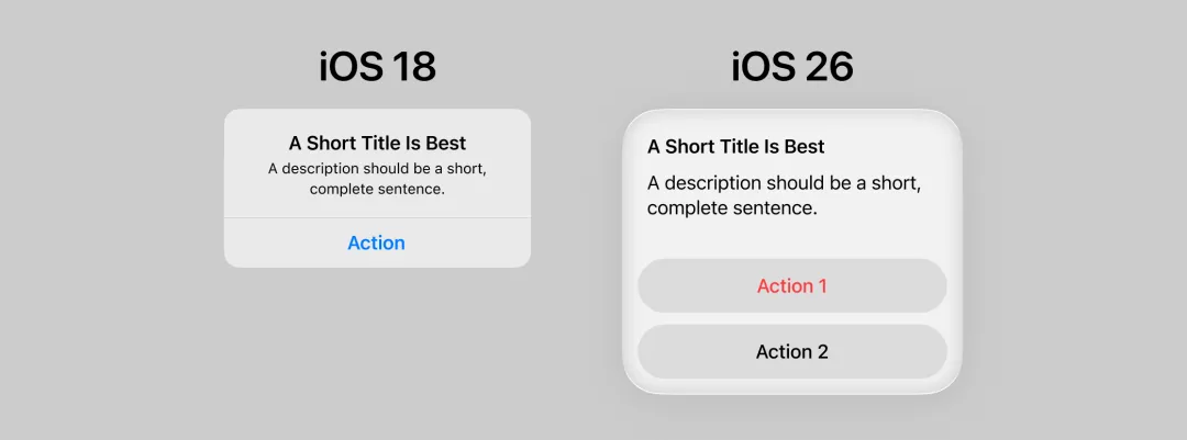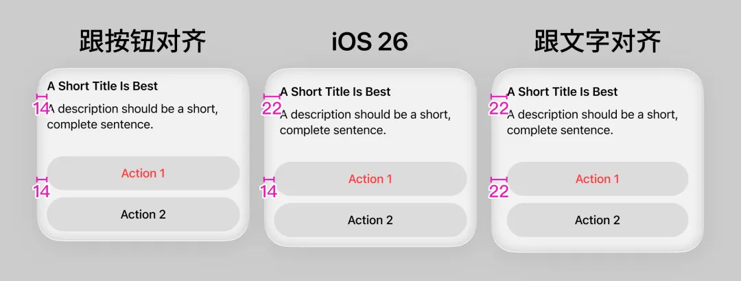 仔细看 iOS 26 的弹窗就会发现,文字边距和按钮边距是不同的。