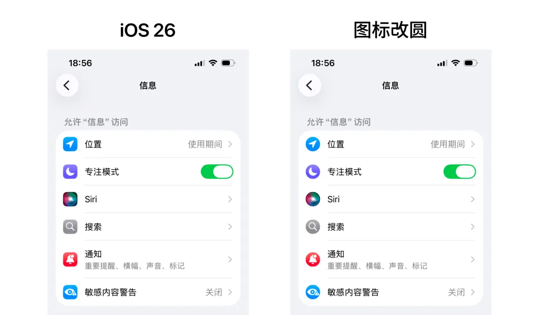 iOS 26 的设置页,图标没有跟外层卡片对齐圆角。如果要对齐,需要把图标改成圆形,但那样会导致视觉上更拥挤,而且识别度下降。