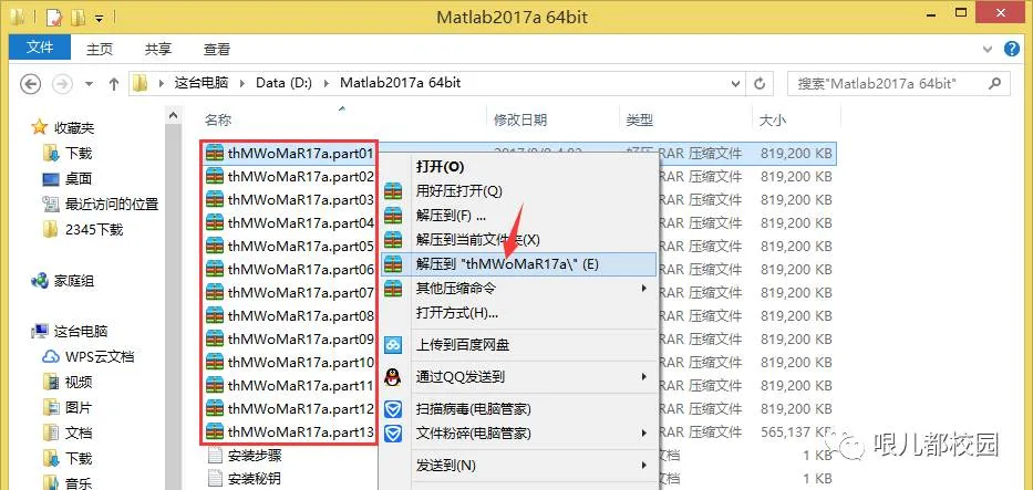 1.如图所示,完整的安装包应该有13个压缩包,必须要全部下载完成才能解压。鼠标右击“thMWoMaR17a.part01.rar”压缩包,选择“解压到thMWoMaR17a”,然后等待解压完成