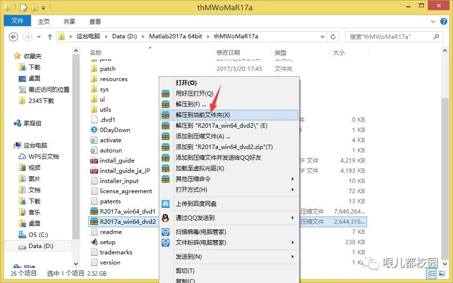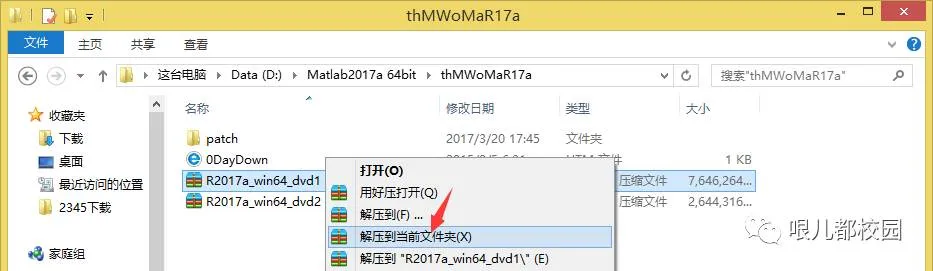 注意:“R2017a_win64_dvd1.iso”和“R2017a_win64_dvd2.iso”两个文件均需要解压,且必须解压到同一个文件夹,如图所示: