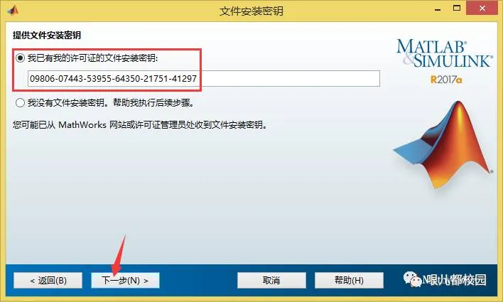 6.打开“Matlab2017a 64bit”文件夹,并在文件夹内找到“安装密钥.txt”文件,打开复制里面的秘钥,然后粘贴到“我已有我的许可证的文件安装密钥”下面的编辑框内,然后点击“下一步”