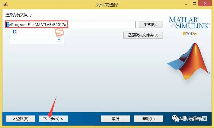 7.接下来选择安装路径(软件较大不建议安装在C盘)。可以使用默认路径,也可以自行更改(路径中不要有中文即可)。然后点击“下一步”。如下图默认路径为:C:\Program Files\MATLAB\R2017a 可以直接将C改为D,安装到D盘