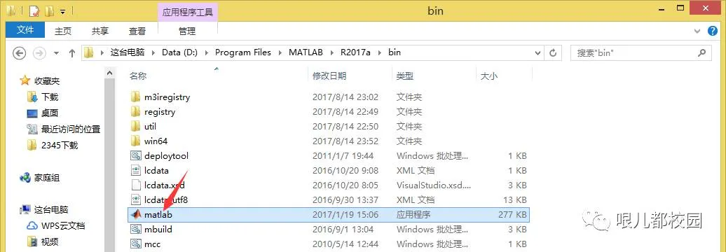 18.如果“桌面”和“开始”里没有MATLAB的快捷启动方式。那么打开“D:\Program Files\MATLAB\R2017a\bin”文件夹(安装路径在哪个盘去哪个盘找这个文件夹),鼠标左键双击“matlab”,即可打开MATLAB(或者鼠标右击“matlab”-“发送到”-桌面快捷方式)