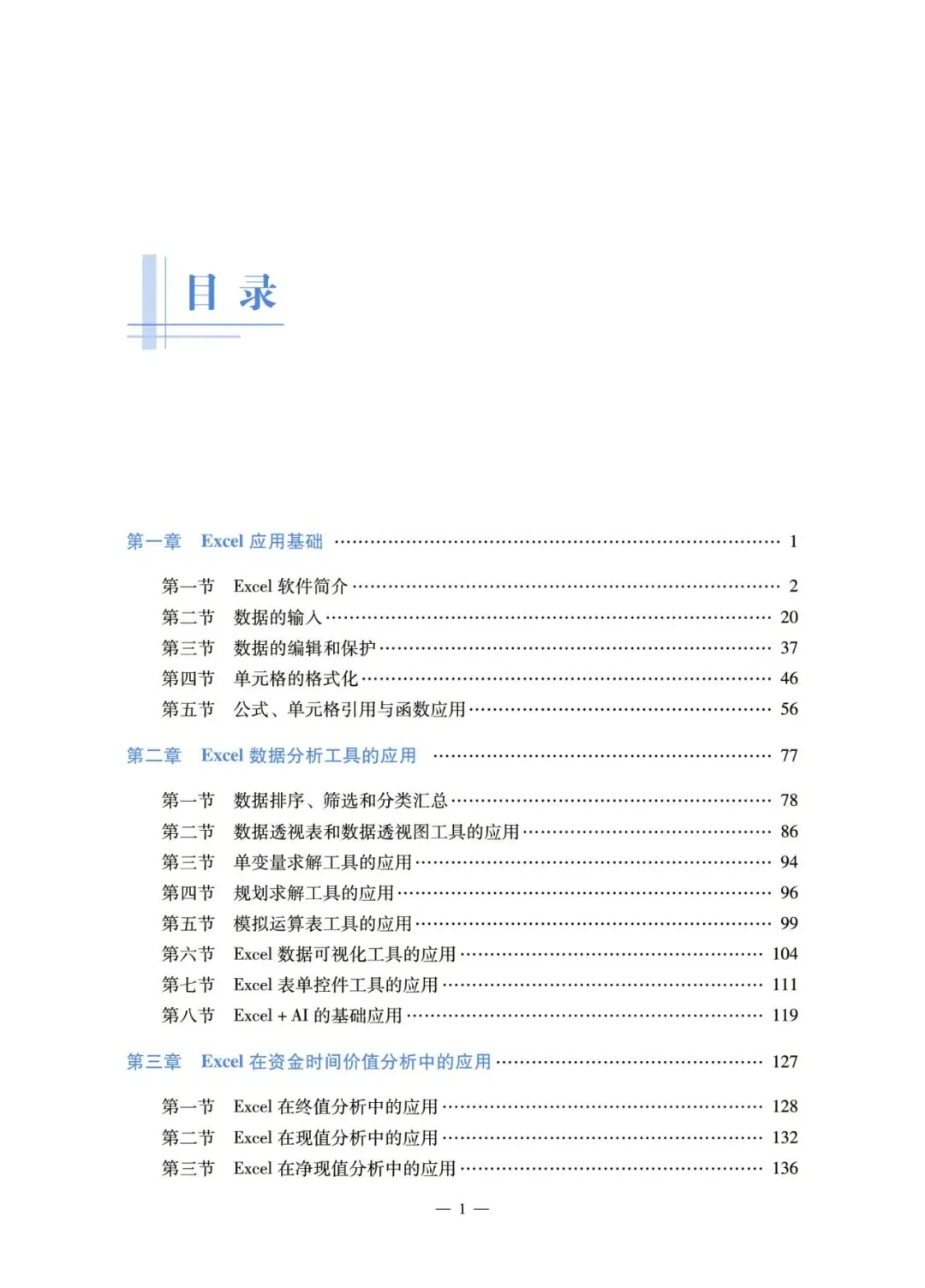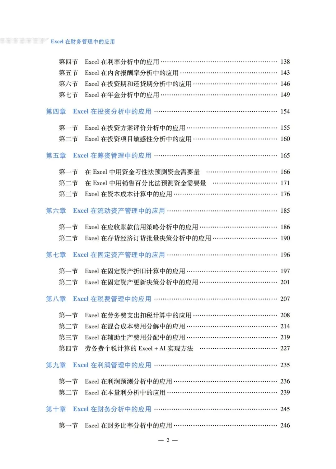 教材涵盖Excel应用基础、数据分析工具应用、资金时间价值分析应用、投资分析应用、筹资管理应用、流动资产管理应用、固定资产管理应用、税费管理应用、利润管理应用、财务分析应用、短期经营决策分析应用,共11章40节。内容覆盖财务管理核心领域,提炼可复制的操作模板与可迁移的解决思路。