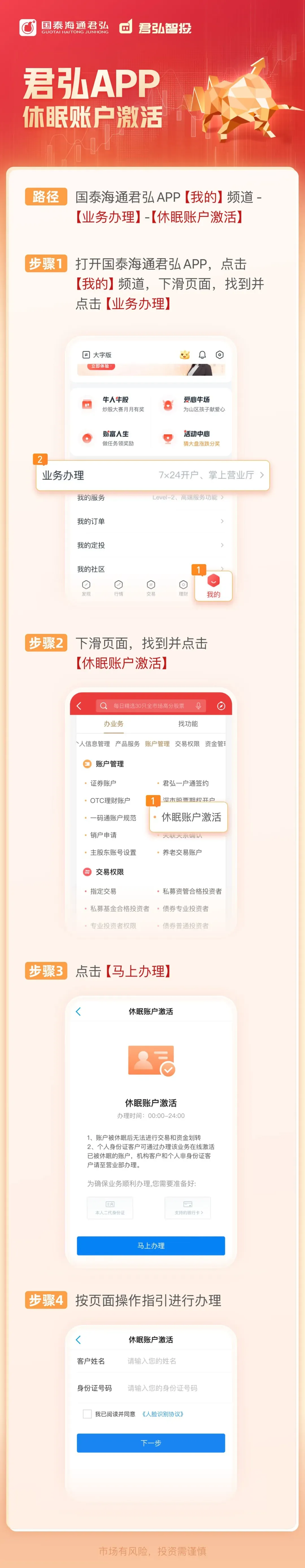 本文最后更新于2026-03-10,某些文章具有时效性,若有错误或已失效,请在下方留言或联系老夜。 国泰海通君弘APP休眠账户激活办理流程 国泰海通证券 国泰海通证券海南分公司(ID:gtht-hn),第一时间对经济热点、市场动态进行盘点!最新股票资讯与创新业务工具让您能够先人一步学会如何理财!