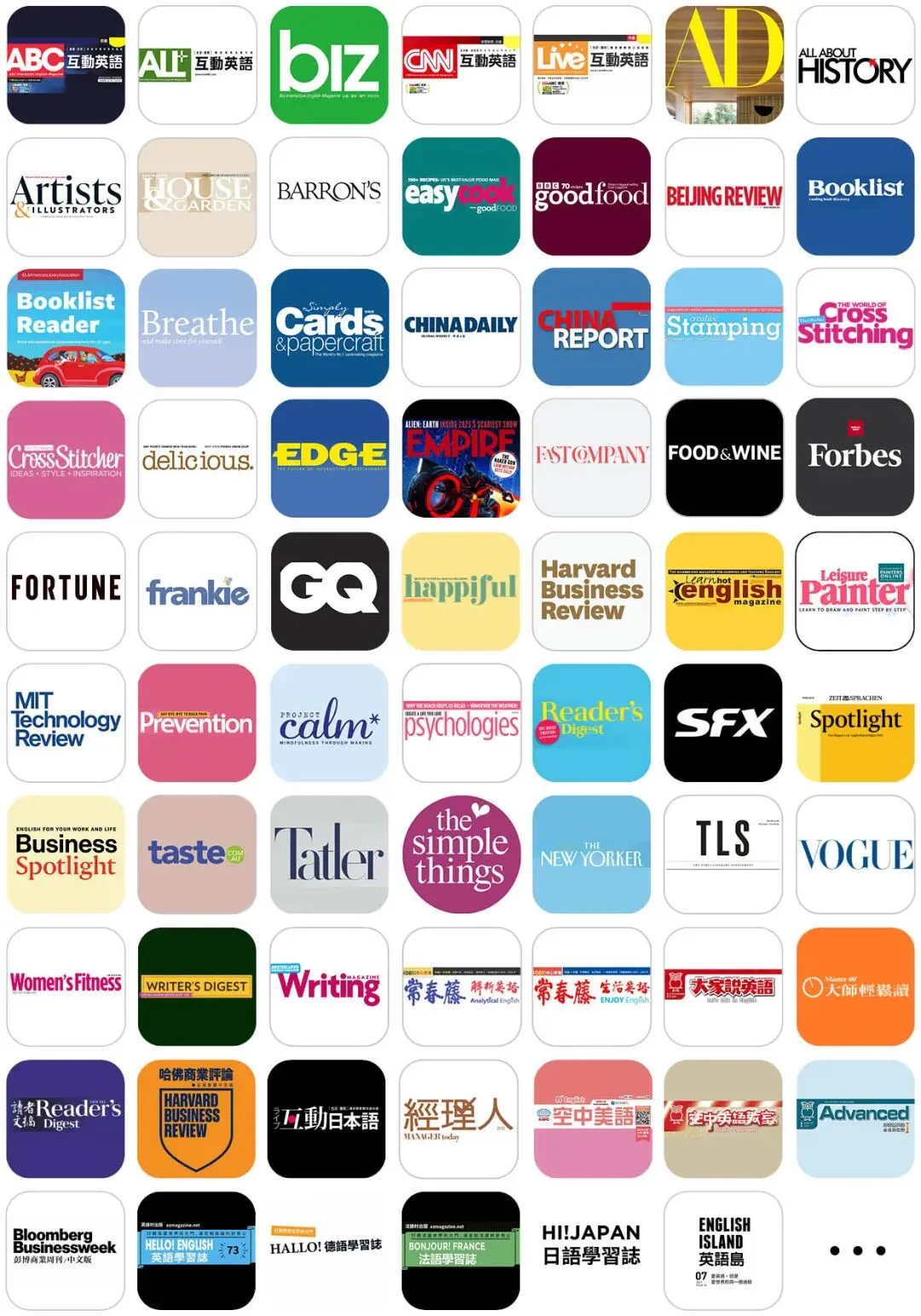 ABC互动英语、ALL+互动英语、Biz互动英语、CNN互动英语、Live互动英语、AARP、Architectural Digest、All about History、Artists & Illustrators、Barron’s、BBC Easy Cook、BBC Good Food、BeijingReview、Booklist、Booklist Reader、Breathe、Cards & Papercraft、China Daily、China Report、Creative Stamping、Cross Stitching、CrossStitcher、delicious、Edge、ELLE、EMPIRE、Esquire、Fast Company、Forbes、Fortune、frankie、GQ、Happiful、Harper’s、Harper’s Bazaar、Harvard Business Review、La Vie、Learn Hot English、Leisure Painter、Marie Claire、Men’s Fitness、Men’s Health、MIT Technology Review、People、Poetry、Prevention、Project Calm、Psychologies、Reader’s Digest、Real Simple、Review of Books、SFX、Spotlight、Business Spotlight、Tatler、The Artist、The Simple Things、The New Yorker、The Writer、Time、TLS、Vanity Fair、Vogue、Wallpaper、Women’s Fitness、Women’s Health、Writer’s Digest、Writing、あまから手帖、常春藤解析英语、常春藤生活英语、大家说英语、大师轻松读、读者文摘、哈佛商业评论、互动日本语、经理人、空中美语、空中英语教室、彭蒙患英语、彭博商业周刊、学习志、英语岛等……