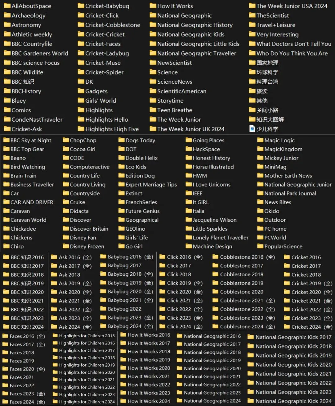 Highlights、Highlights Hello、Highlights High Five、Ask、Babybug、Click、Cobblestone、Cricket、Faces、Ladybug、Muse、Spider、100% Wow、AirForces Monthly、Al l About space、American Scientist、Archaeology、Astronomy、Athletic weekly、BBC Countryfile、BBC Gardeners World、BBC History、BBC Knowledge、BBC science Focus、BBC Sky at Night、BBC Top Gear、BBC Wildlife、BBC 知识、Bluey、Brainspace、Car、Computeractive、Conde Nast Traveler、Cuddles、DK、Eco Kids、Evo、Gadgets、Girls’ World、Go Girl、How lt Works、It GiRL、MiniMag、National Geographic、National Geographic History、National Geographic Kids、National Geographic Little Kids、National Geographic Traveller、NewScientist、ROVA、Science、Science illustrated、Science News、Scientific American、Smithsonian、Sports Illustrated、Sports Illustrated Kids、Storytime、Stuff、T3、Techlife News、Teen Breathe、The Scientist、The Week Junior、Travel+Leisure、Unicorn Universe、Very Interesting、Very Interesting Junior、What Doctors Don’t Tell You、What on Earth、Who Do You Think You Are、World Soccer、国家地理、环球科学、料理台湾、旅读、旅人志、妈妈宝宝、少年牛顿、乡间小路、知识大图解、知识就是力量等……
