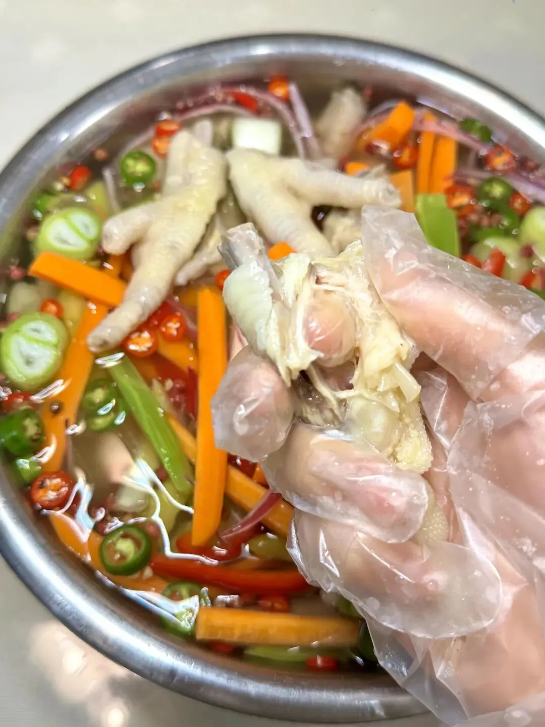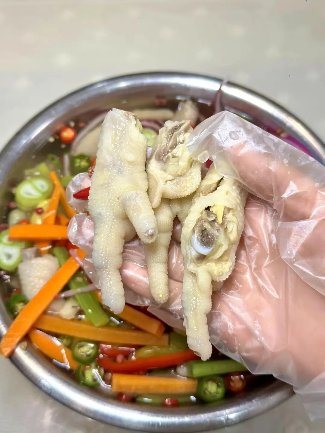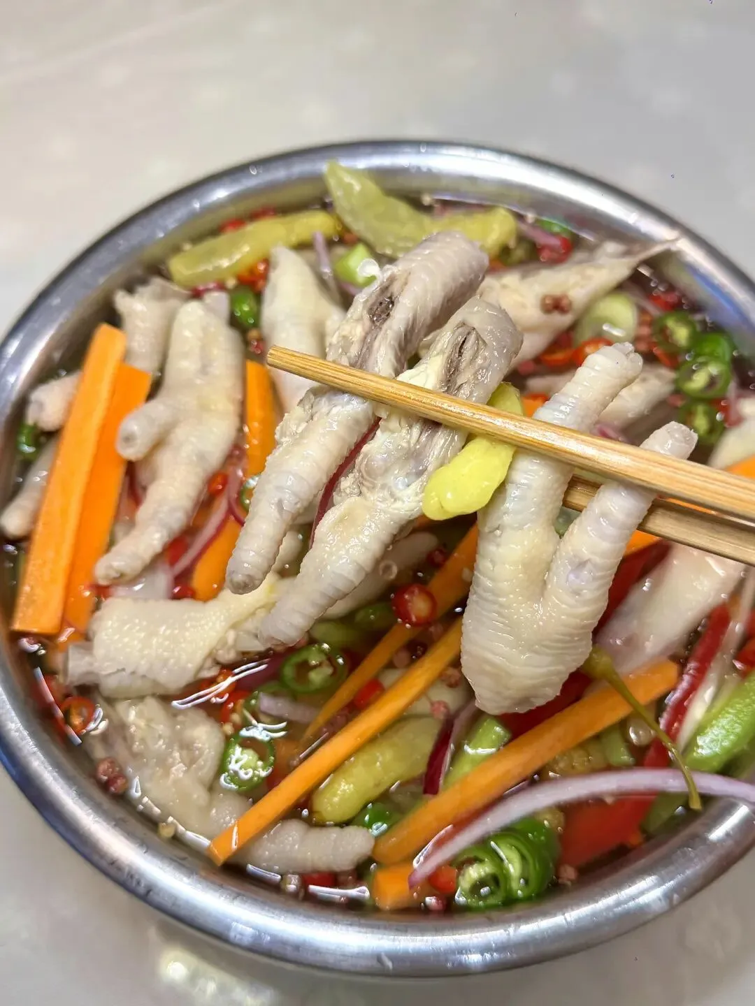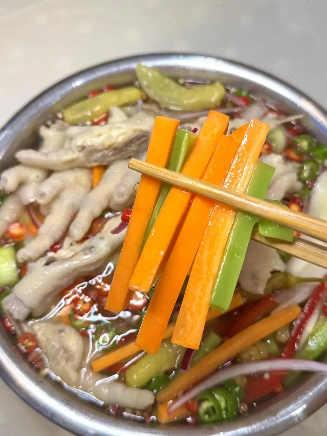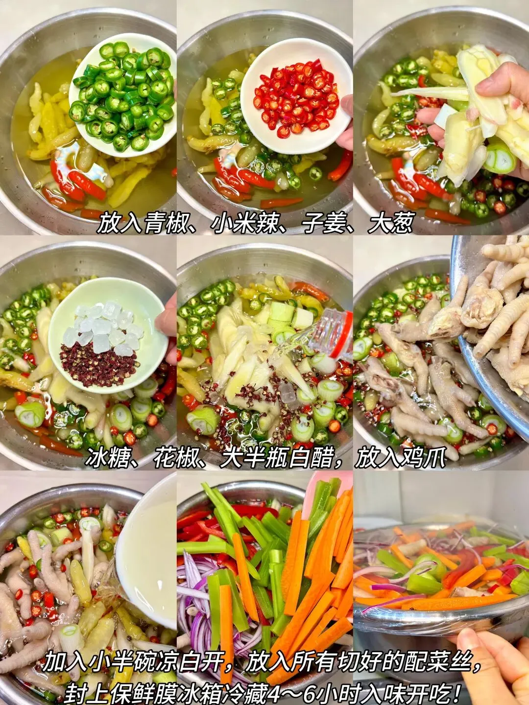3灵魂料汁:泡椒水+盐鸡精味精1勺+青椒+小米辣+子姜大葱+冰糖花椒+大半瓶白醋半碗凉白开4盆里放鸡爪+洋葱丝+甜椒丝+胡萝卜丝+莴笋丝抓匀,尝尝味道缺啥补啥!
