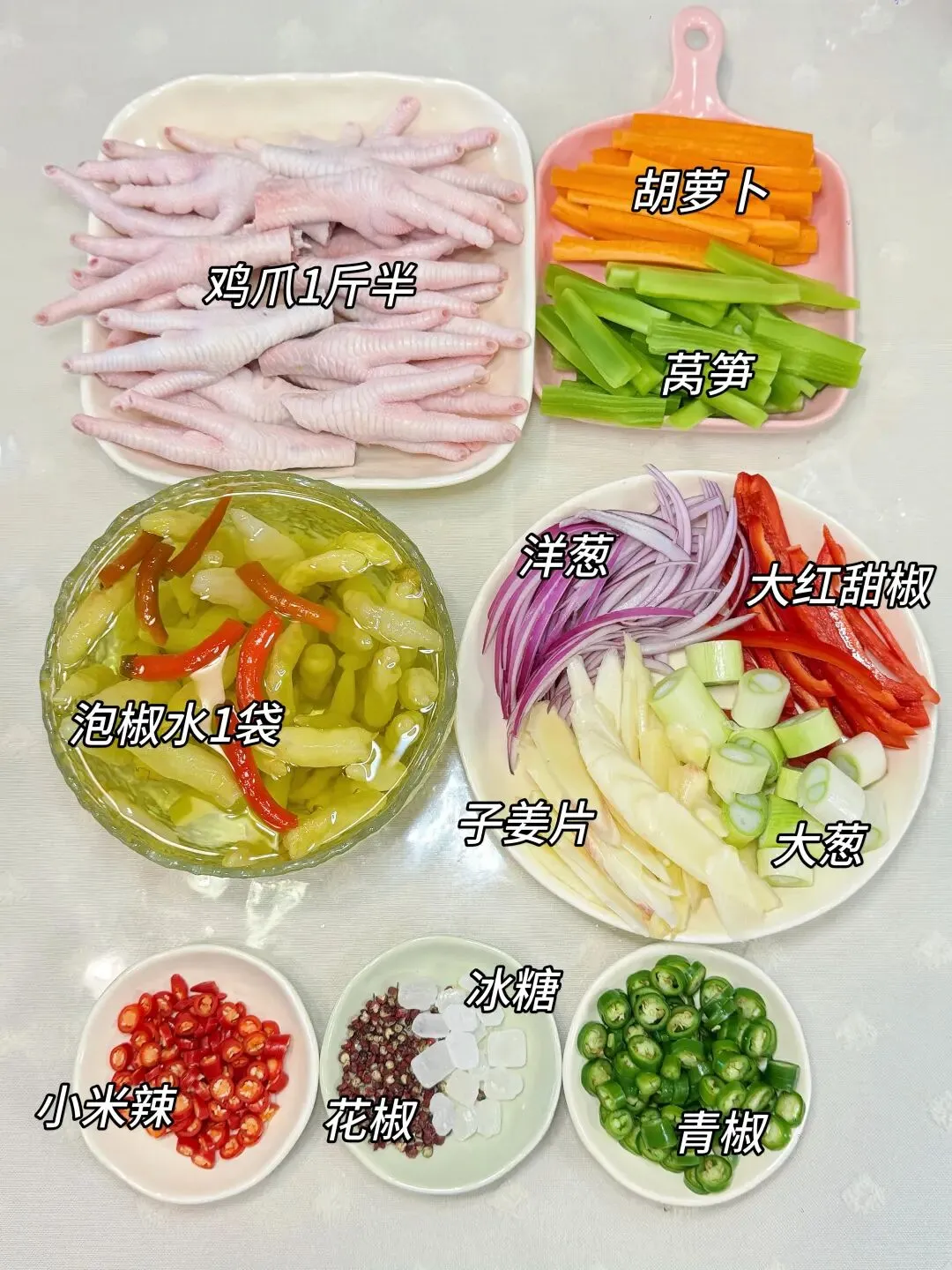 食材随便买: 鸡爪1斤半、小米辣、大甜椒、青椒、泡椒(带水)、子姜、大葱、洋葱、胡萝卜丝、莴笋丝、 花椒、冰糖(如图6)