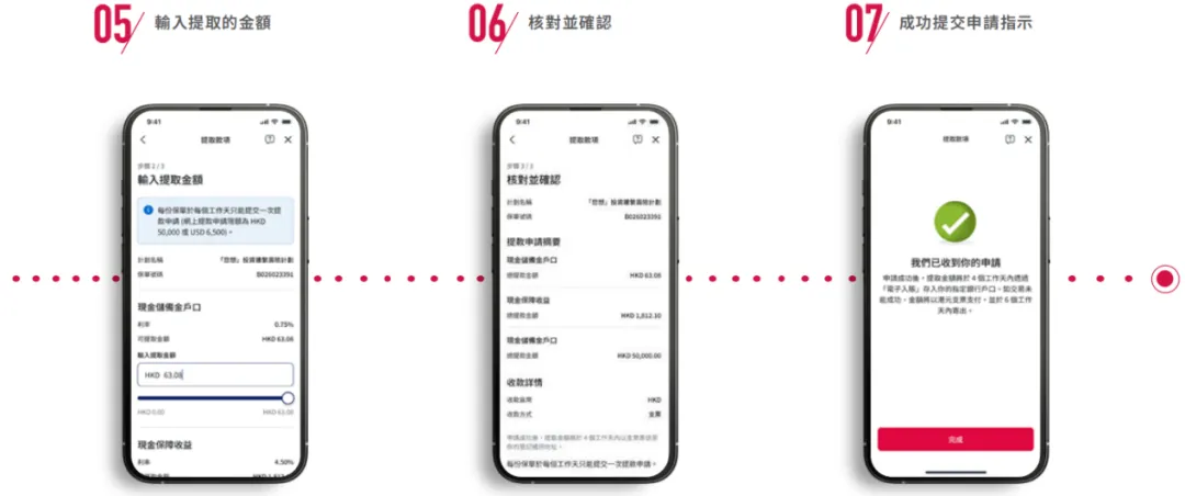 选择转数快提取保单价值:每份保单单次提取上限为 100 万港元,款项将直接存入预设的转数快收款账户,到账快捷。