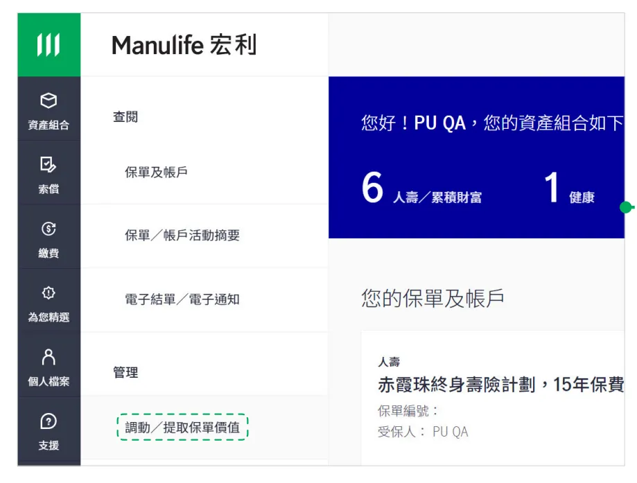 操作路径:登录宏利官网 → 进入资产组合→ 选择调动 / 提取保单价值,按页面指引完成后续操作即可。
