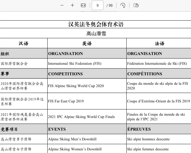 北京冬奥组委对外联络部立足北京2022年冬奥会和冬残奥会语言服务工作需要,以历届冬奥会尤其是平昌2018年冬奥会体育术语为蓝本,以北京冬奥会和冬残奥会体育项目为主线,参考SportsDefinitions.com等国际体育网站,充分征求了北京冬奥会各竞赛项目主任等相关专业人士意见,编制出冬奥会体育词汇合集《汉英法冬奥会体育术语》。该书将主要用于各类语言服务场景及相关专业志愿者培训,为北京冬奥组委各业务领域提供参考。