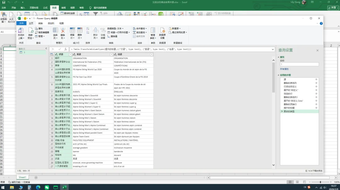 首先,将原始术语资料生成 SDL MultiTerm Convert 支持的 excel 文档。我拿到的《汉英法冬奥会体育术语》是 pdf 格式,要想导入 Trados 创建术语库,必须得先把 pdf 转化成 xlsx,也就是 excel 文档。这里用到的是 office 办公软件 excel 里的 Power Query 编辑器。